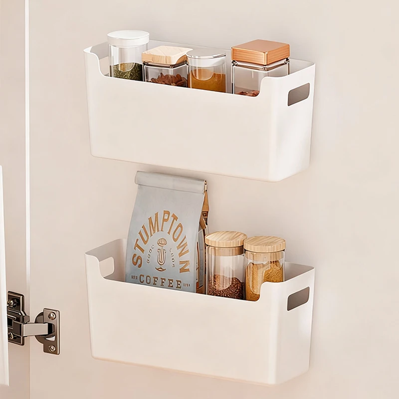 cabinet door organizer, no drill wall mount storage box, multipurpose hanging basket, kitchen pantry door organizer, plastic storage container, adhesive shelf for cabinet, bathroom closet organizer, countertop desktop organizer, space saving storage solution, kitchen accessory organizer, wall mount bin for spices, modular storage container |