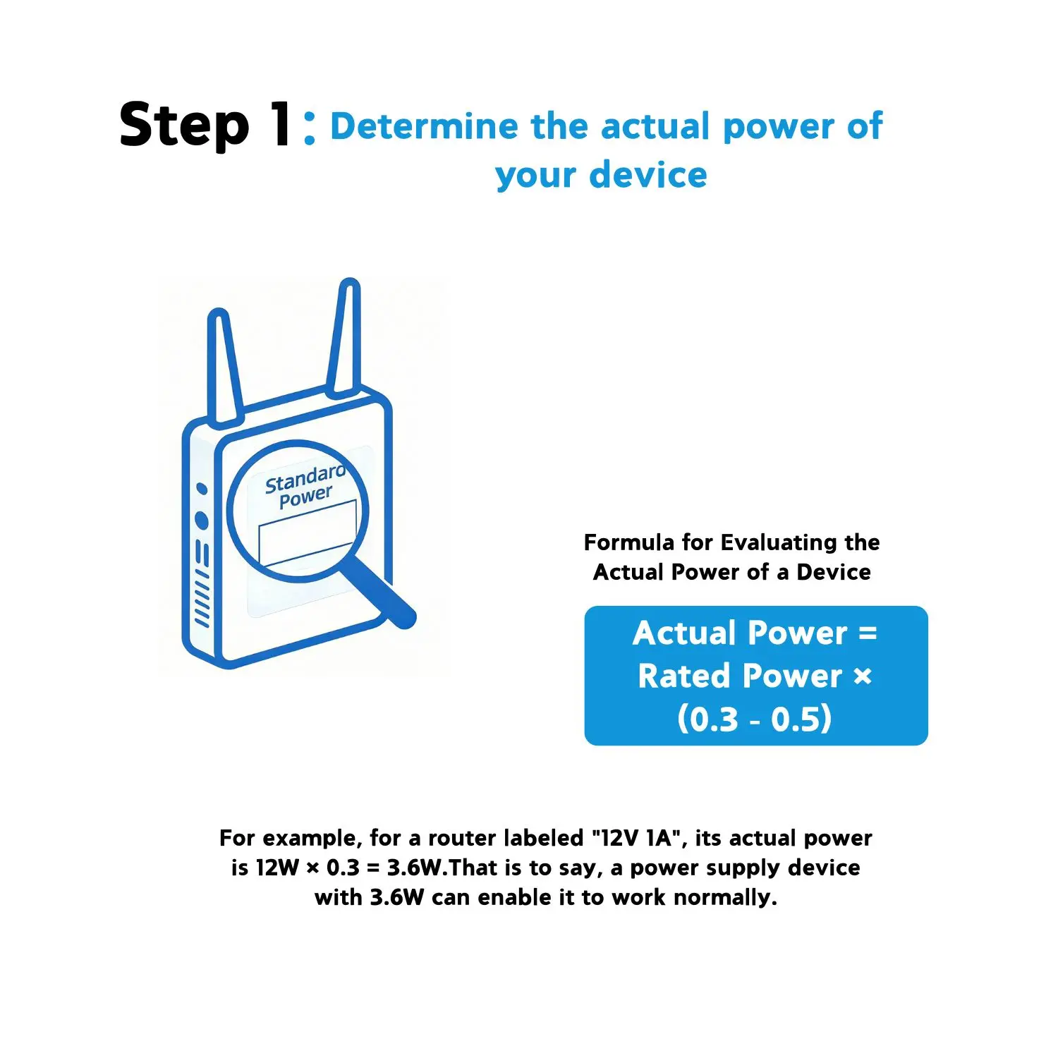 ตัวอย่างเช่น เราเตอร์ที่มีป้ายกำกับ “12V 1A” มีกำลังไฟที่กำหนดไว้ 12 วัตต์กำลังไฟจริงคือ 12W × 0.3 = 3.6W ซึ่งหมายความว่าสามารถทำงานได้ด้วยแหล่งจ่ายไฟ 3.6W