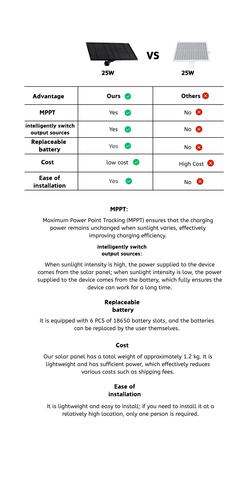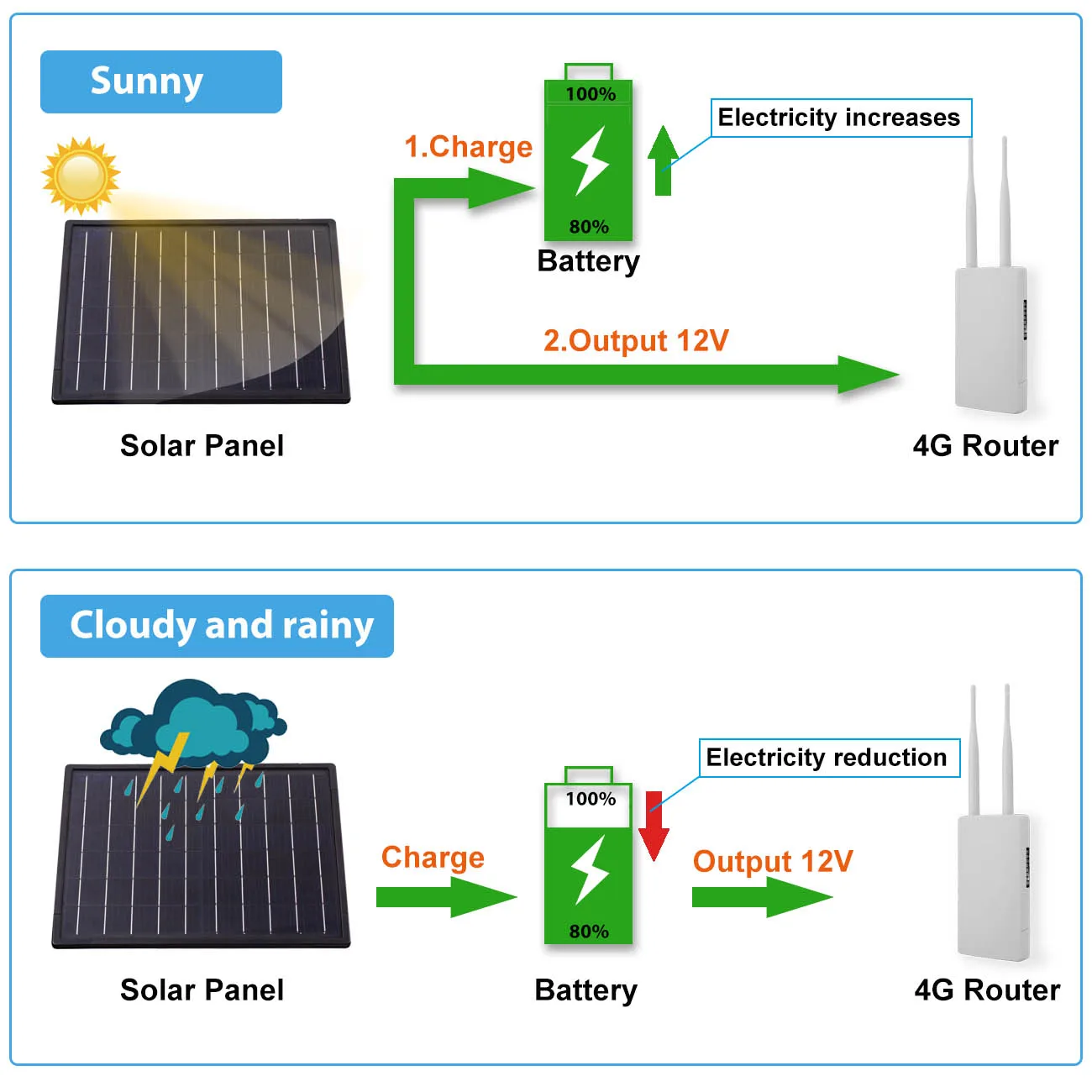แผงโซลาร์เซลล์มีตัวควบคุม MPPT ในตัว ประสิทธิภาพการชาร์จเพิ่มขึ้น 30% และแบตเตอรี่จะเต็มภายใน 4-5 ชั่วโมงและจ่ายไฟ 12V1A ที่เสถียรเพื่อให้แน่ใจว่าเราเตอร์ทำงานได้อย่างเสถียร