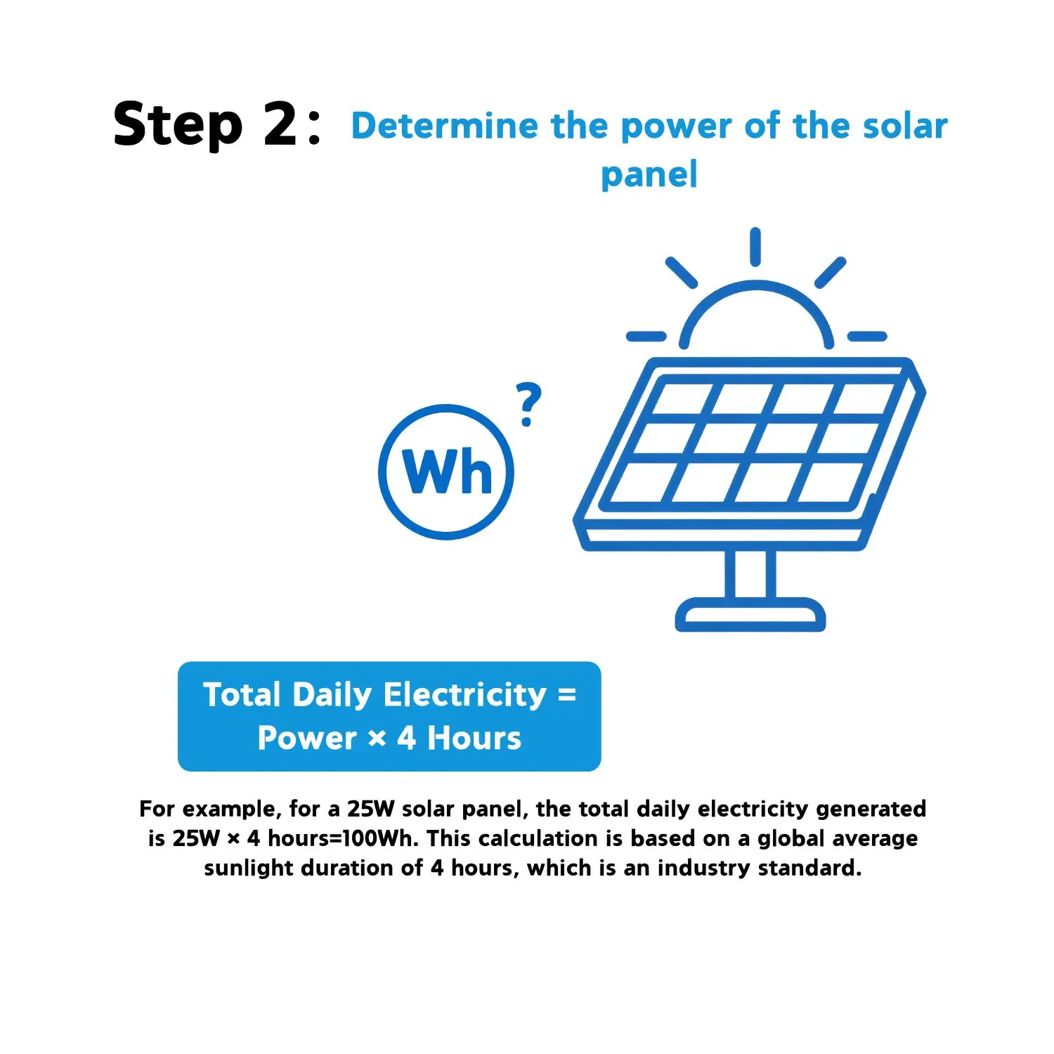 ตัวอย่างเช่น แผงโซลาร์เซลล์ขนาด 25 วัตต์ จะผลิตพลังงานไฟฟ้าได้ทั้งหมด 25 วัตต์ × 4 ชั่วโมง = 100 วัตต์-ชั่วโมงการคำนวณนี้อิงตามระยะเวลาการส่องสว่างของแสงอาทิตย์โดยเฉลี่ยทั่วโลก 4 ชั่วโมงต่อวัน
