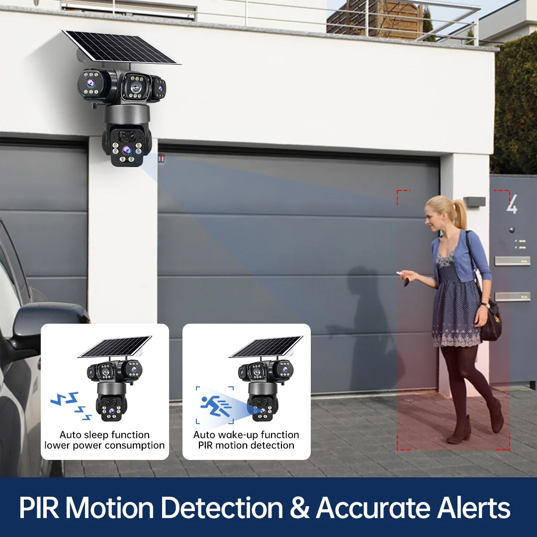 15MP 8K ไวไฟเอชดีกล้องสามเลนส์กล้องไอพีพลังงานแสงอาทิตย์กลางแจ้งไร้สายกันน้ำ PIR การมองเห็นตอนกลางคืน AI การติดตามมนุษย์การเฝ้าระวัง