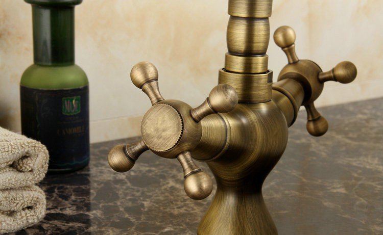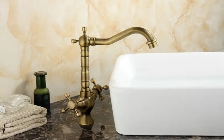 โบราณก๊อกน้ําห้องครัวทองเหลือง Hot & Cold Sink ก๊อกน้ําคู่ 360 หมุนสูง Spout Mixer Tap XR-GZ-7305