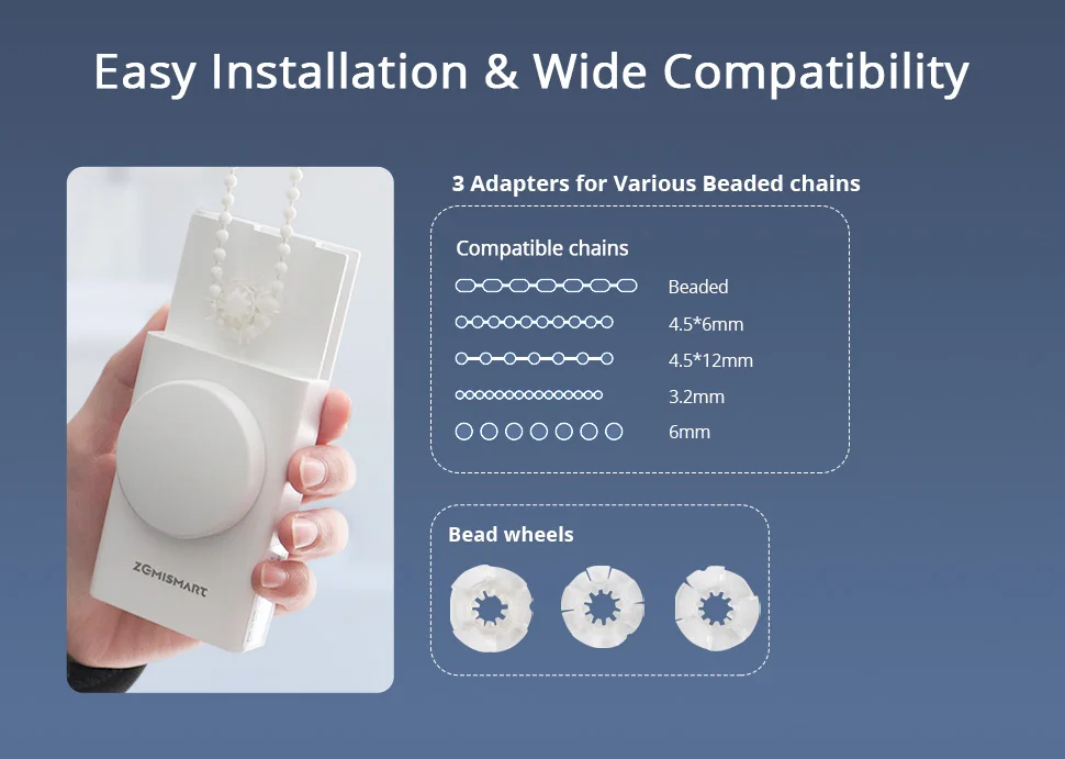 – มาพร้อมล้อลูกปัด 3 แบบ ใช้ได้กับโซ่ลูกปัดที่มีความหนา 3-6 มม. เหมาะสำหรับผ้าม่านหลายแบบ(หมายเหตุ: ผลิตภัณฑ์นี้เข้ากันไม่ได้กับเชือก)