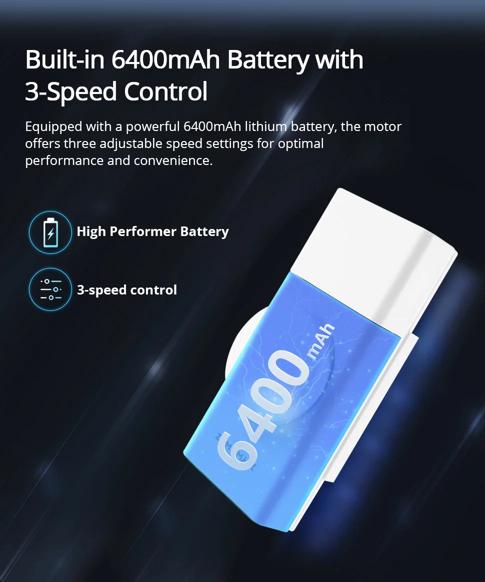 – 3 ระดับความเร็วให้เลือก: ด้วยปุ่มหมุน คุณสามารถปรับความเร็วของตัวขับเคลื่อนได้ตามต้องการ ไม่ว่าจะเป็นความเงียบสงบของความเร็วต่ำ หรือประสิทธิภาพที่รวดเร็วของความเร็วสูง ทุกอย่างอยู่ในมือคุณ