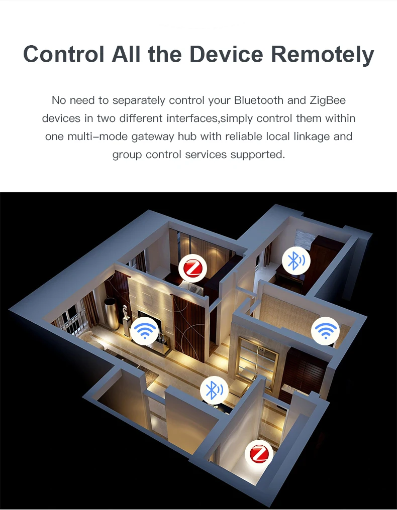 3.มีรีโมทคอนโทรล: ควบคุมอุปกรณ์ที่เชื่อมต่อกับเกตเวย์ผ่านโทรศัพท์มือถือผ่านแอปอัจฉริยะ Tuya จากระยะไกลไม่ว่าคุณจะอยู่ที่ไหนก็ตามไม่จำเป็นต้องควบคุมอุปกรณ์บลูทูธและซิกบีของคุณแยกกันในสองอินเทอร์เฟซที่แตกต่างกันเพียงควบคุมอุปกรณ์เหล่านั้นภายในฮับเกตเวย์แบบมัลติโหมดเดียวพร้อมบริการเชื่อมโยงท้องถิ่นและบริการควบคุมกลุ่มที่เชื่อถือได้