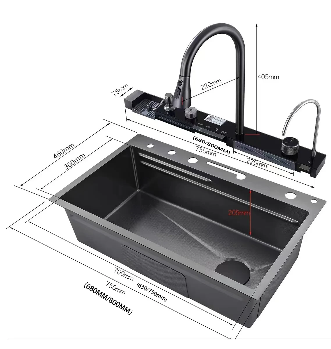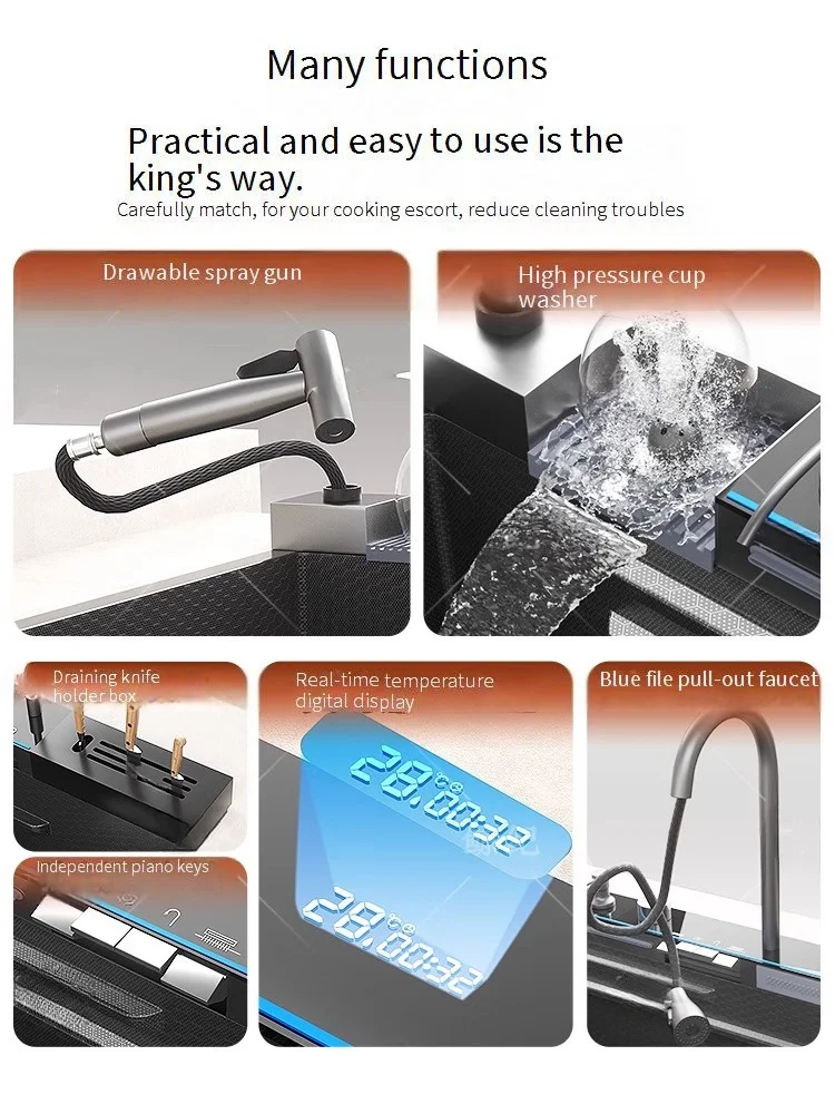 อ่างล้างจานสแตนเลสแบบน้ำตกพร้อมหน้าจอดิจิตอล อ่างล้างจานอเนกประสงค์ขนาดใหญ่แบบช่องเดียว มีหลายแบบให้เลือก