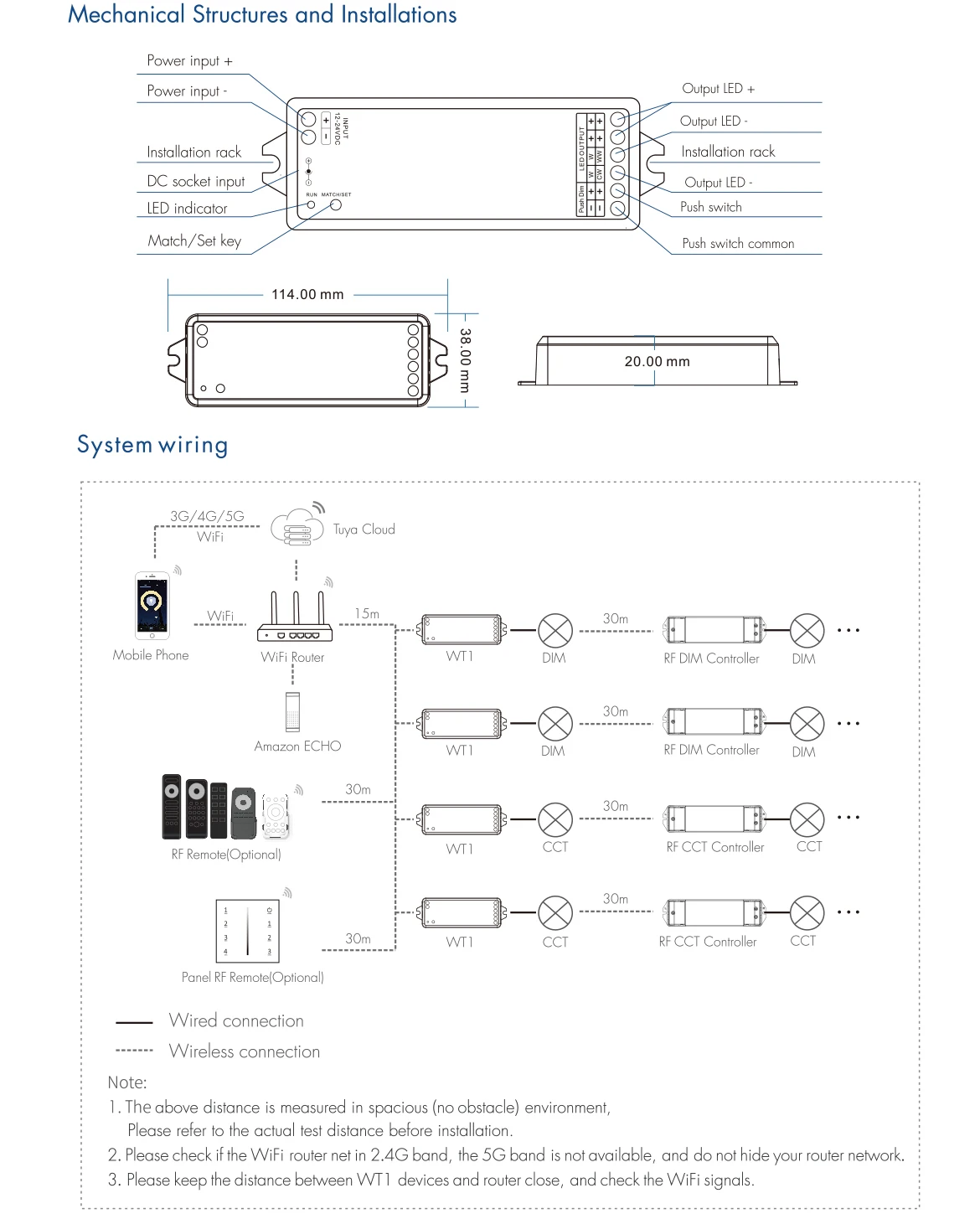 ● คอนโทรลเลอร์ WT1 แต่ละตัวยังสามารถทำงานเป็นตัวแปลง WiFi-RF ได้ จากนั้นใช้ Tuya APP เพื่อควบคุมคอนโทรลเลอร์ RF LED ตั้งแต่หนึ่งตัวขึ้นไป