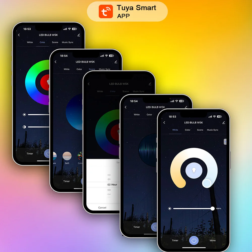 ● การควบคุมผ่านระบบคลาวด์ด้วยแอป Tuya รองรับการเปิด/ปิด, ปรับอุณหภูมิสีและความสว่าง, และตั้งค่าการเปิด/ปิดไฟแบบหน่วงเวลา