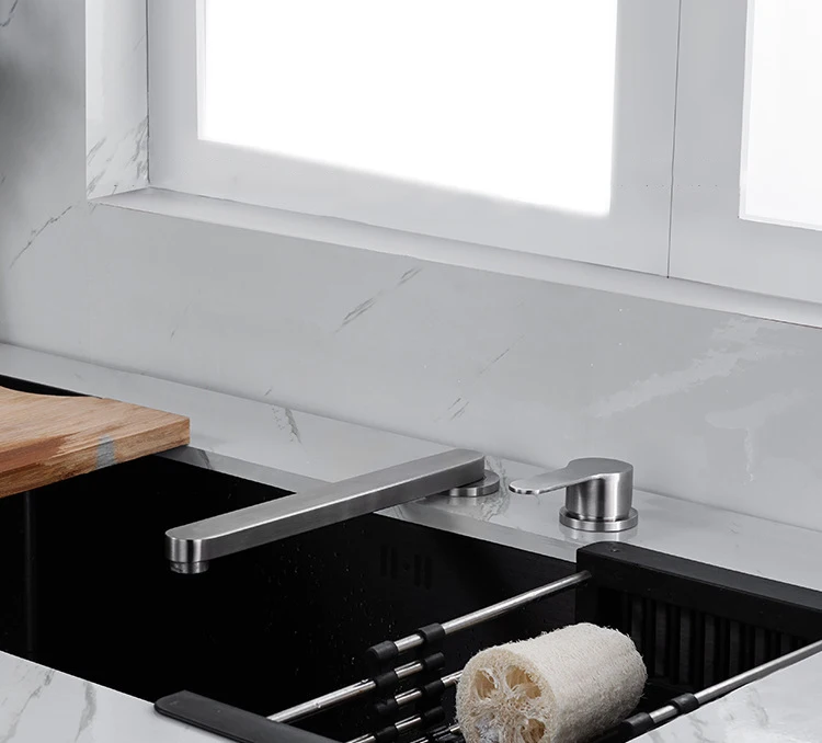 304 ก๊อกน้ําอ่างล้างจานสแตนเลสซ่อนยกพับก๊อกน้ําห้องครัวร้อนและเย็นผสมน้ําแยกอ่างล้างจาน TAP Dual หลุม จาก 1 รีวิว