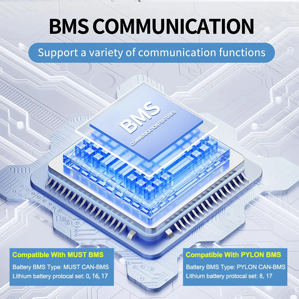 อินเวอร์เตอร์มีโปรโตคอล BMS ในตัวเพื่อการสื่อสารแบตเตอรี่ลิเธียมที่ราบรื่นใช้งานได้กับแบตเตอรี่ลิเธียม MUST และ PYLON ผ่านโปรโตคอล CAN
