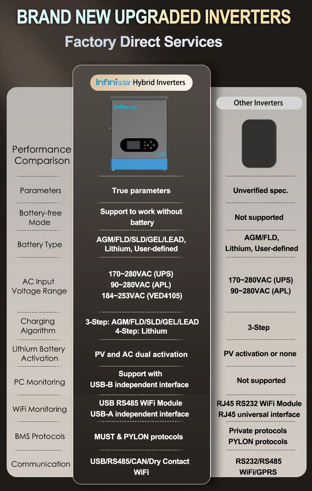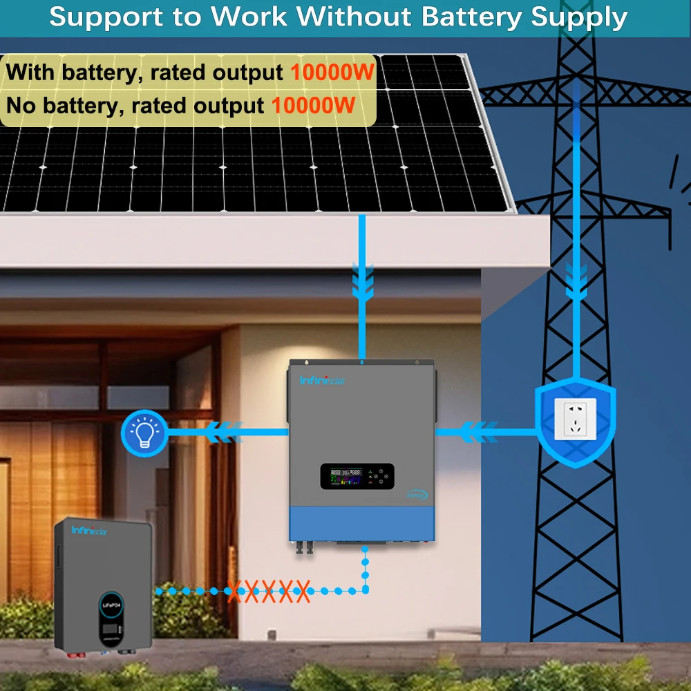 Infinisolar 10KW Off Grid HYBRID SOLAR INVERTER สูงสุด 6 Parallel Dual MPPT 48V ถึง 230V พลังงานแสงอาทิตย์อินเวอร์เตอร์สนับสนุน WiFi BMS