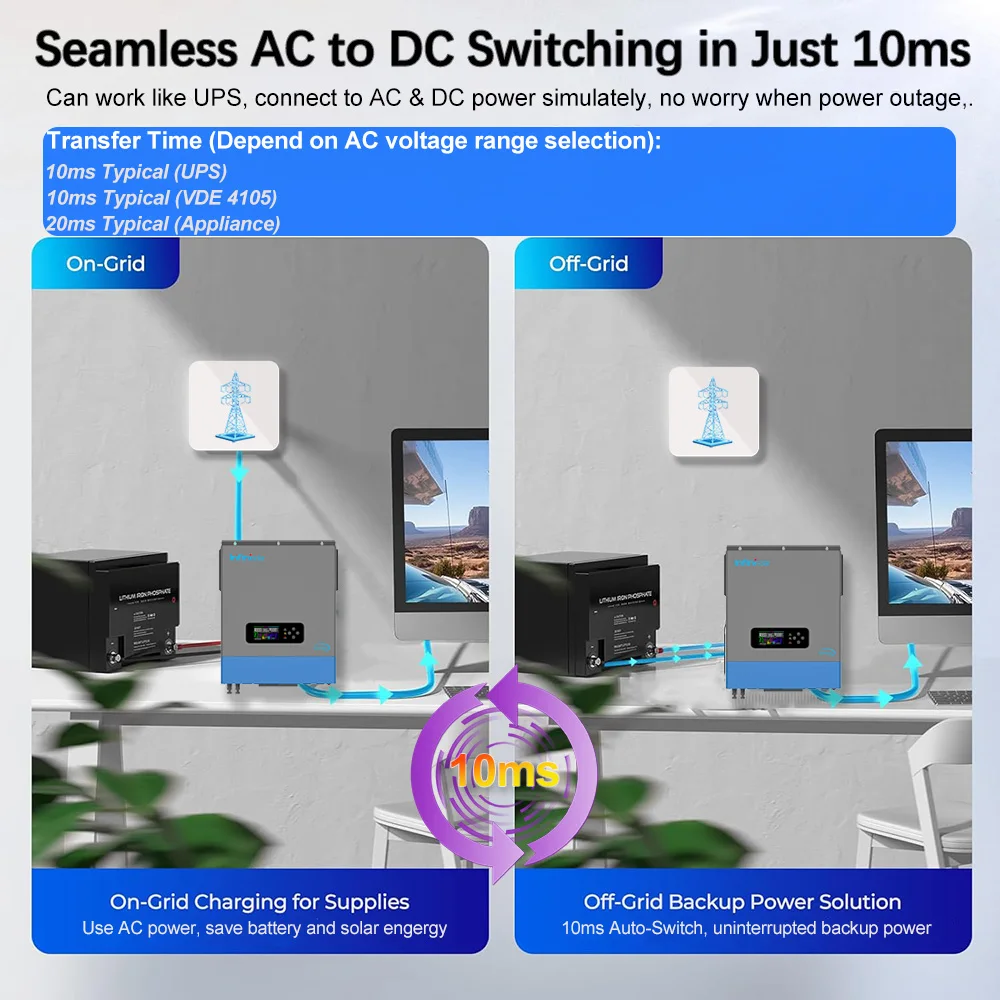 สามารถทำงานเหมือน UPS ได้ การสลับไฟ AC และ DC อัตโนมัติ 10ms/20ms ช่วยให้มั่นใจได้ว่าไฟจะไม่ขาดตอนสำหรับโหลดที่สำคัญระหว่างการเปลี่ยนผ่านของระบบไฟฟ้า