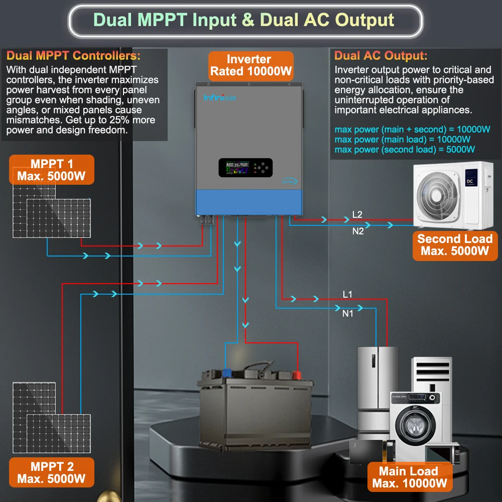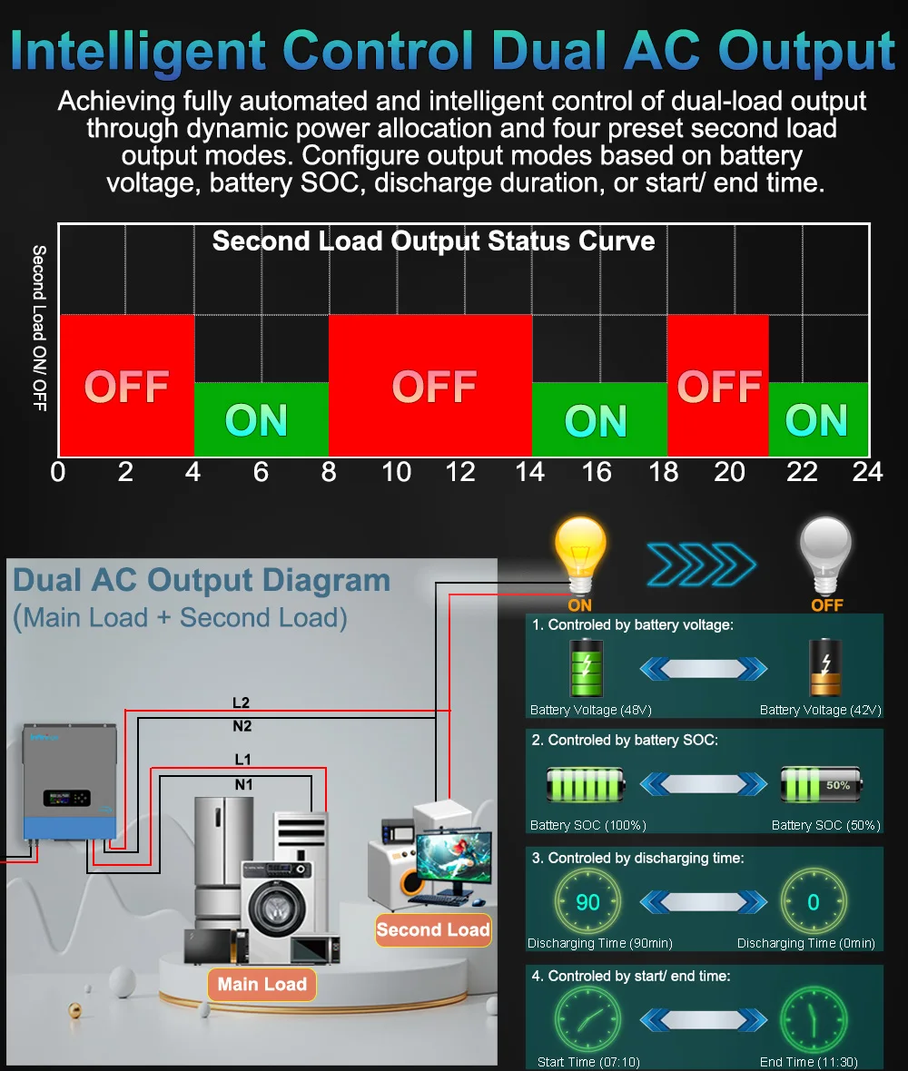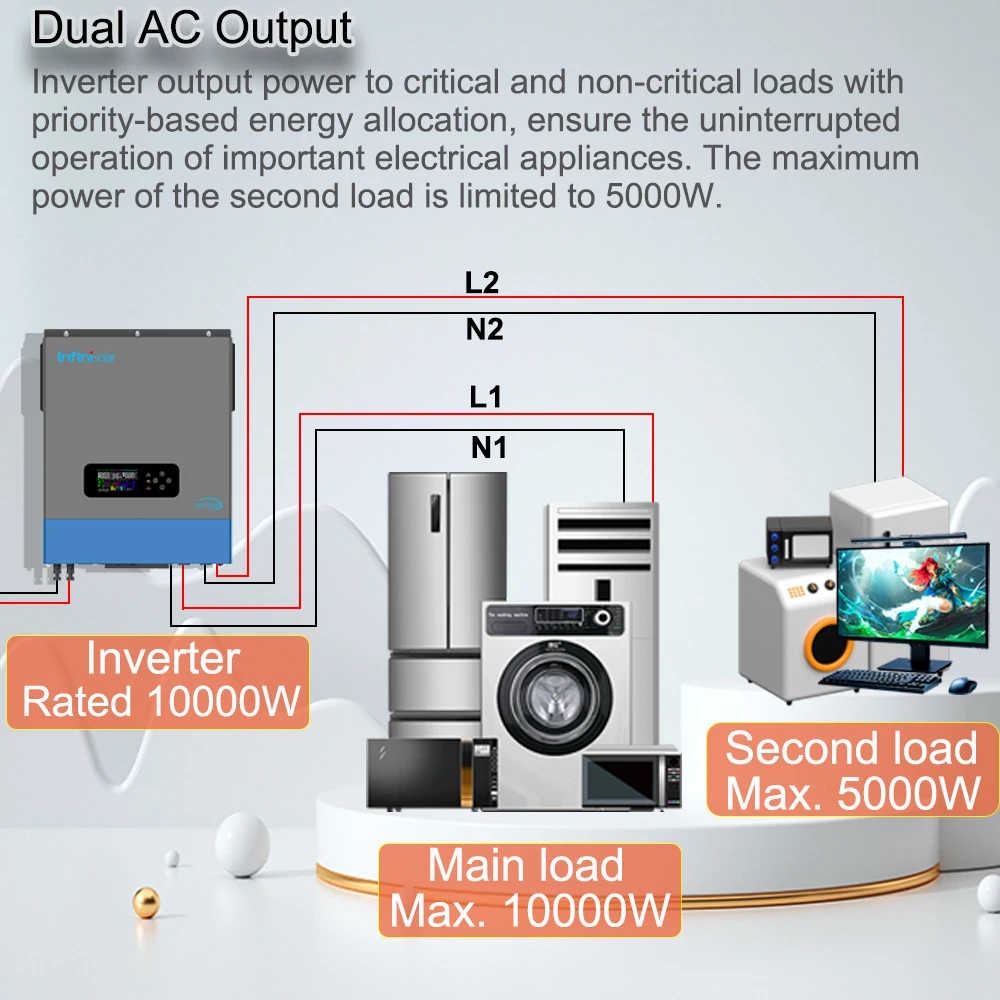 จ่ายไฟจากอินเวอร์เตอร์ไปยังโหลดที่สำคัญและไม่สำคัญ โดยจัดสรรพลังงานตามลำดับความสำคัญ เพื่อให้มั่นใจว่าเครื่องใช้ไฟฟ้าที่สำคัญจะทำงานอย่างต่อเนื่องกำลังไฟสูงสุดของโหลดที่สองถูกจำกัดไว้ที่ 5000W