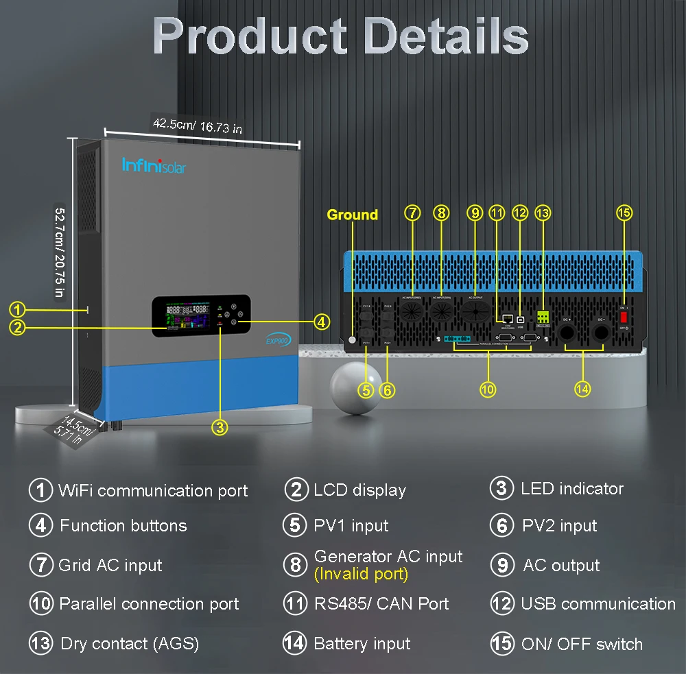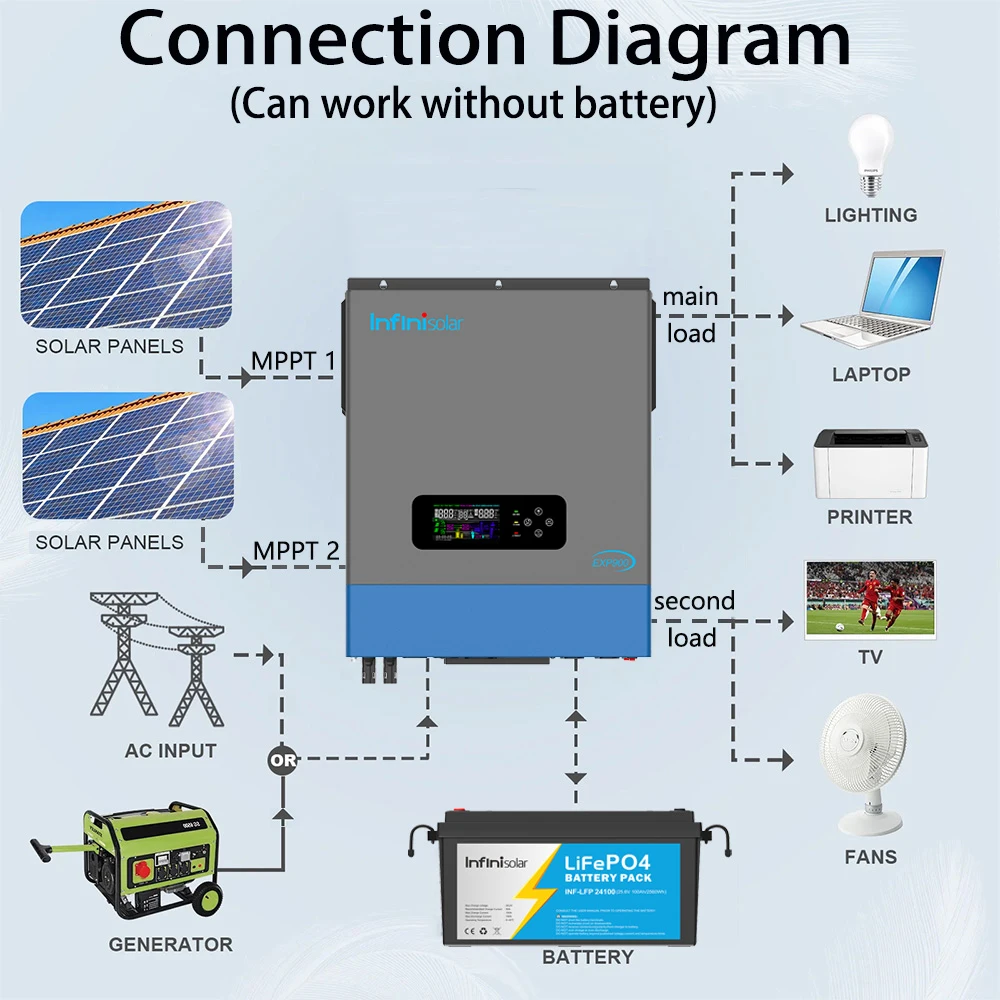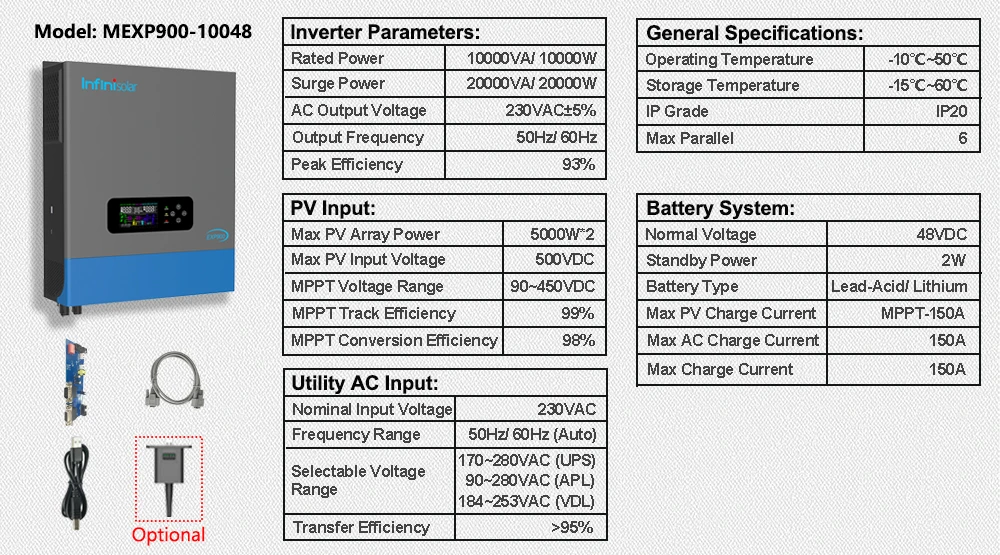 อินเวอร์เตอร์ Infinisolar MEXP900-10048 เป็นอินเวอร์เตอร์พลังงานแสงอาทิตย์แบบครบวงจร ขนาด 10KW 48V เป็น 220V/230V/240V เฟสเดียว แบบออฟกริด พร้อมเครื่องชาร์จ MPPT 150A และเครื่องชาร์จ AC 150A ในตัวการผสานระบบพลังงานแสงอาทิตย์, ไฟฟ้ากระแสสลับจากแหล่งสาธารณูปโภค/เครื่องกำเนิดไฟฟ้า, และแบตเตอรี่ เพื่อมอบแหล่งจ่ายพลังงานที่ไม่ขาดตอน