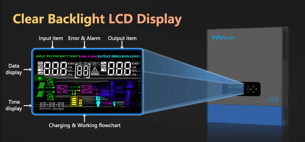 ด้วยปุ่มฟังก์ชันและจอ LCD ที่แสดงสถานะการทำงานและข้อมูลกำลังไฟฟ้าเข้า/ออก ช่วยให้คุณตั้งค่าพารามิเตอร์ต่างๆ เช่น กระแสไฟชาร์จแบตเตอรี่ โหมดการทำงาน ฯลฯ