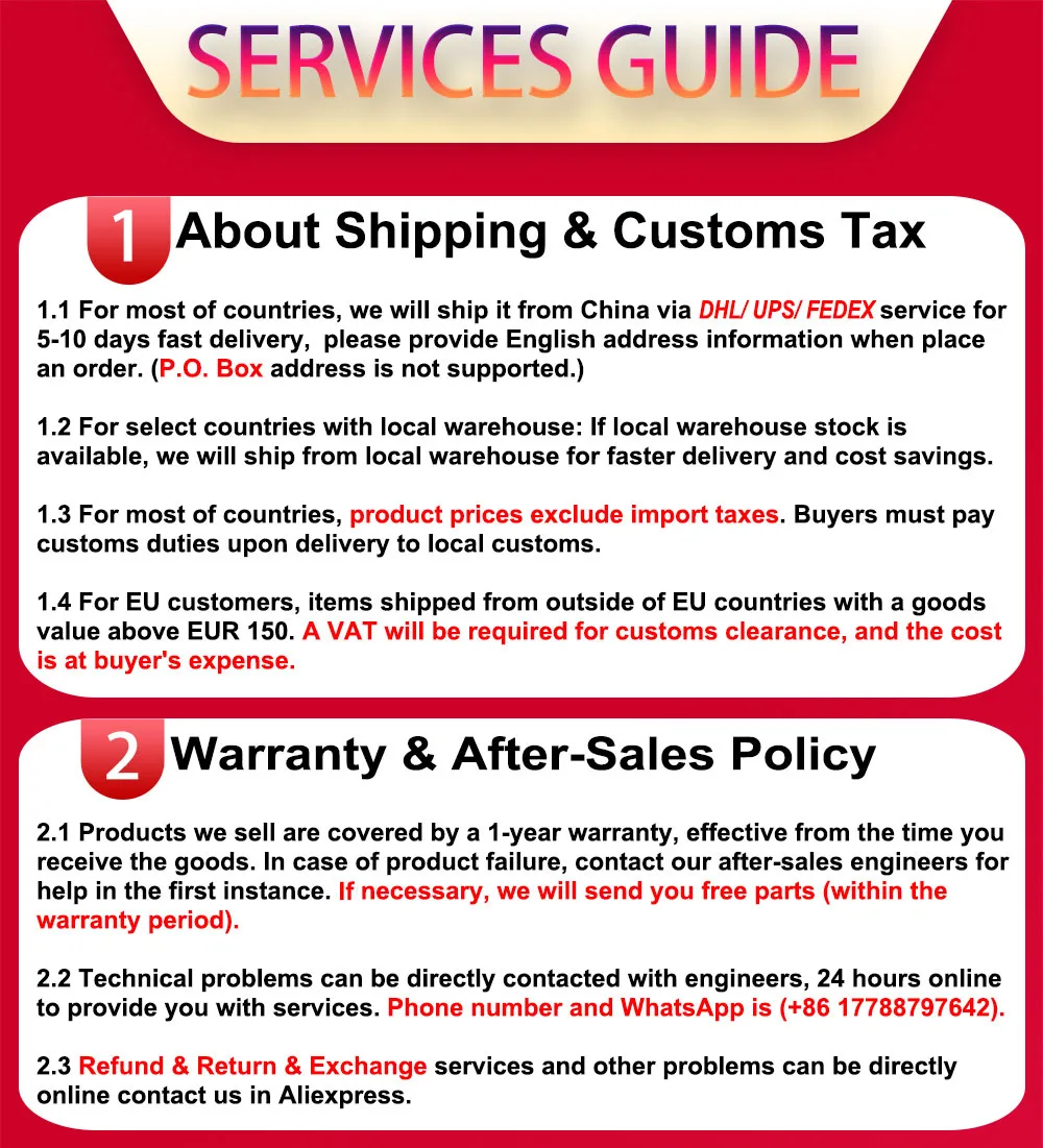 ● ผลิตภัณฑ์ทั้งหมดมีการรับประกัน 1 ปีหากเกิดปัญหาด้านคุณภาพ ทีมสนับสนุนเฉพาะของเราจะรับประกันว่าจะแก้ไขปัญหาภายใน 24 ชั่วโมง