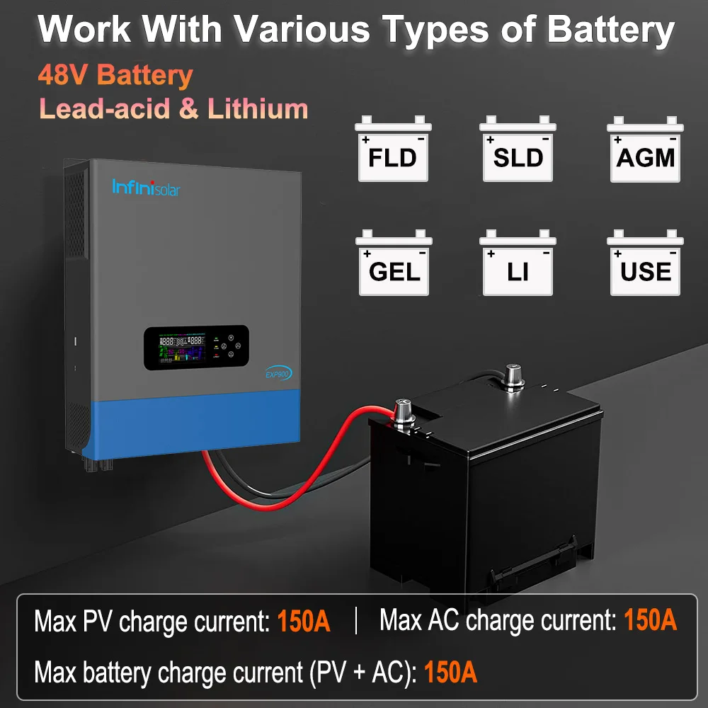 อินเวอร์เตอร์นี้รองรับแบตเตอรี่ได้หลากหลายประเภท สามารถเชื่อมต่อกับแบตเตอรี่ตะกั่ว-กรด 48V (AGM, GEL, FLA, SLA…) แบตเตอรี่ลิเธียม (LiFePO4) และแบตเตอรี่ที่ผู้ใช้กำหนดเองได้