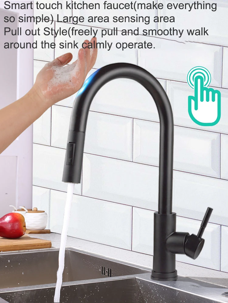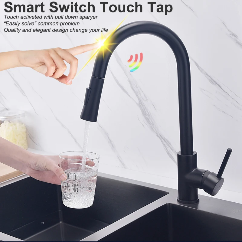 สมาร์ทสัมผัสบนก๊อกน้ําห้องครัว 304 สแตนเลสสตีลร้อนเย็นอ่างล้างจานแตะสีดํา Sensor Touch อ่างล้างจานก๊อกน้ํา