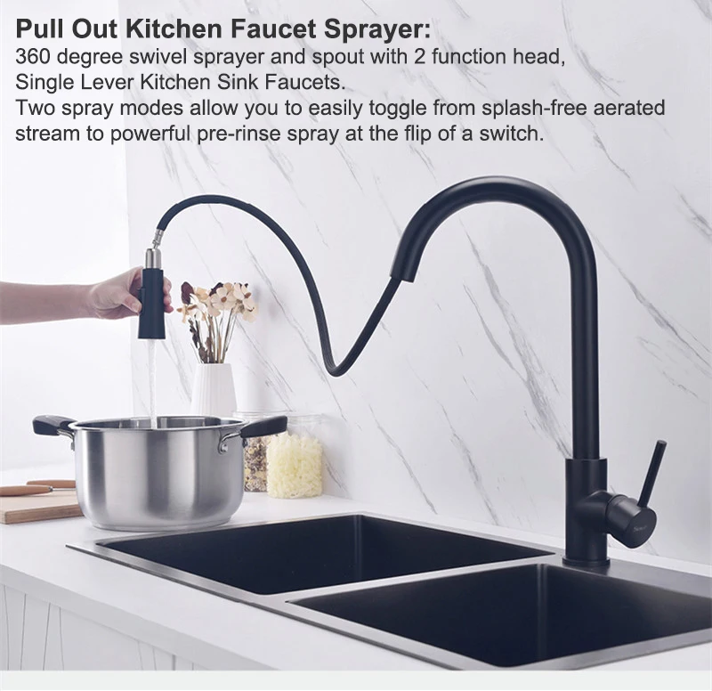 ☛ หัวฉีดแบบดึงออก: หัวฉีดและหัวพ่นหมุนได้ 360 องศา, หัวพ่นแบบโค้งสูงหมุนได้ 360 องศา สามารถให้การล้างอ่างล้างจานได้รอบด้าน, ก๊อกน้ำแบบมือจับเดี่ยวสามารถควบคุมอุณหภูมิและปริมาณน้ำได้สะดวกยิ่งขึ้นก๊อกน้ำอเนกประสงค์สำหรับอ่างล้างจานช่วยอำนวยความสะดวกในงานต่างๆ ภายในพื้นที่ครัว
