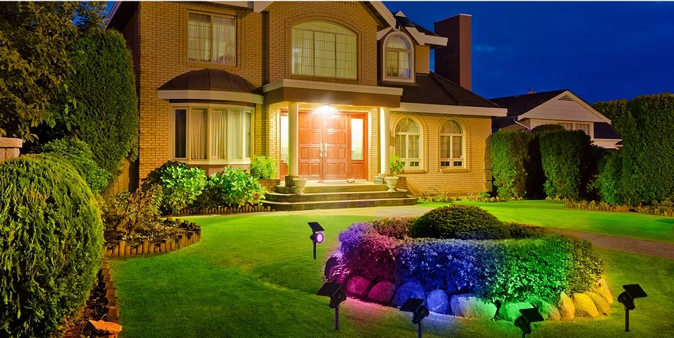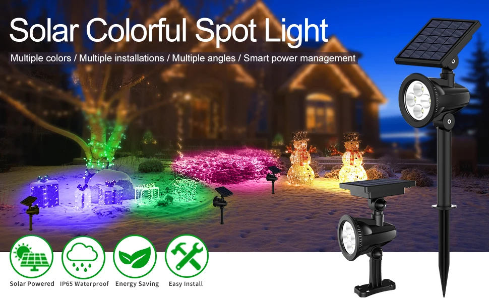 ไฟสปอตไลท์พลังงานแสงอาทิตย์มีค่าเริ่มต้นเป็นสีขาวนวล และสามารถเลือกสีเฉพาะเพิ่มเติมได้อีก 8 สีแดง, เหลือง, เขียวอ่อน, เขียว, ฟ้า, น้ำเงิน, ม่วง และ ชมพูการตั้งค่าการเปลี่ยนสีแบบเรียลไทม์เหมาะสำหรับงานปาร์ตี้ และสามารถปรับเพิ่มเติมได้ เช่น การหน่วงเวลาเปลี่ยนสีเป็น 3 วินาที หรือหน่วงเวลาเป็น 30 นาที ตามความต้องการของคุณ ไฟสปอตไลท์กลางแจ้งสำหรับสนามหญ้า