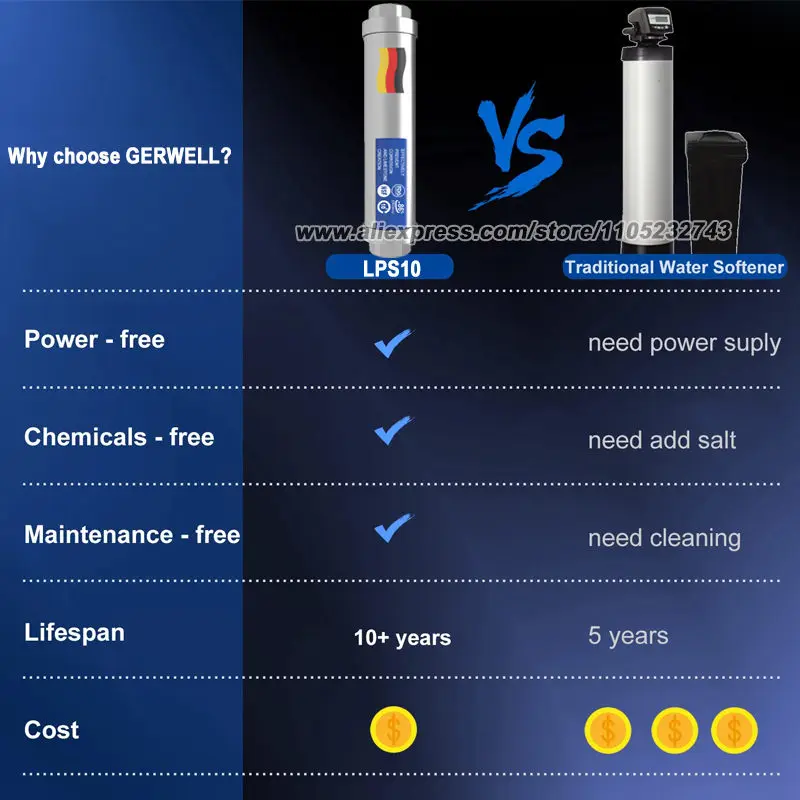 แก้ปัญหาน้ำกระด้างโดยไม่ต้องใช้สารเคมี เกลือ หรือการบำรุงรักษา พร้อมทั้งคงแร่ธาตุที่ดีต่อสุขภาพในน้ำ โดยป้องกันการเกิดตะกรันและช่วยให้ตะกรันที่มีอยู่สลายตัว