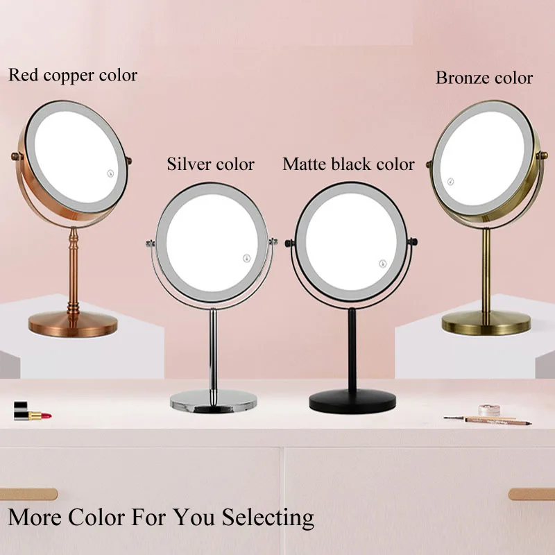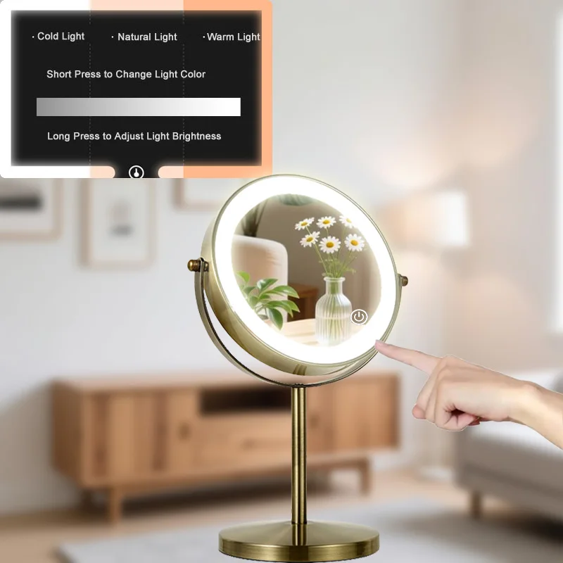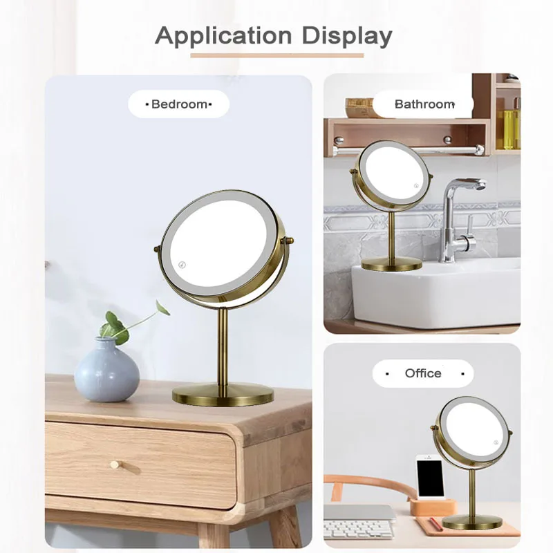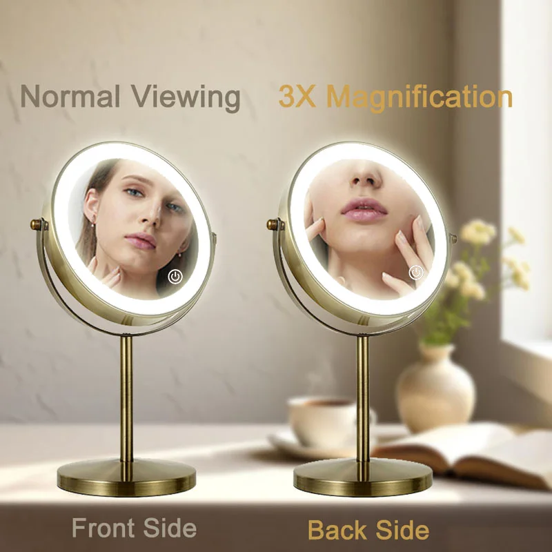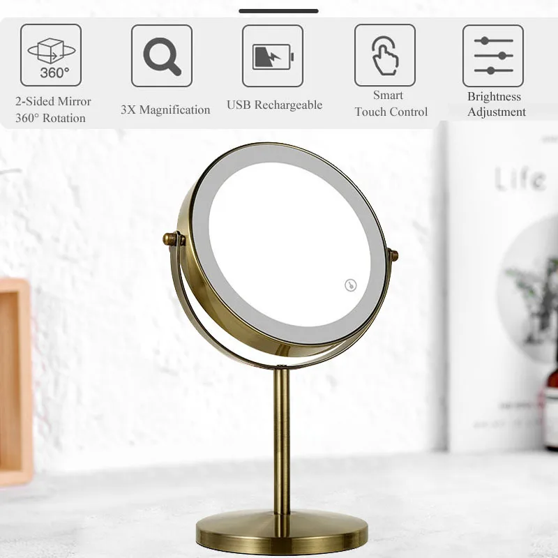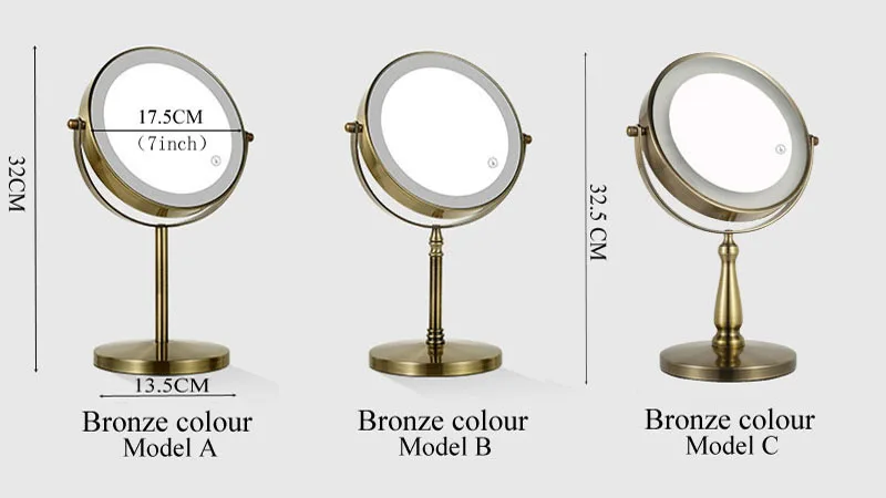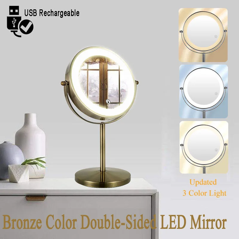 กระจกแต่งหน้า LED สองด้านสีบรอนซ์, กระจกแต่งหน้า 3X/5X, ใช้พลังงานจาก USB, ระบบควบคุมแบบสัมผัส 3 สีและปรับความสว่างได้