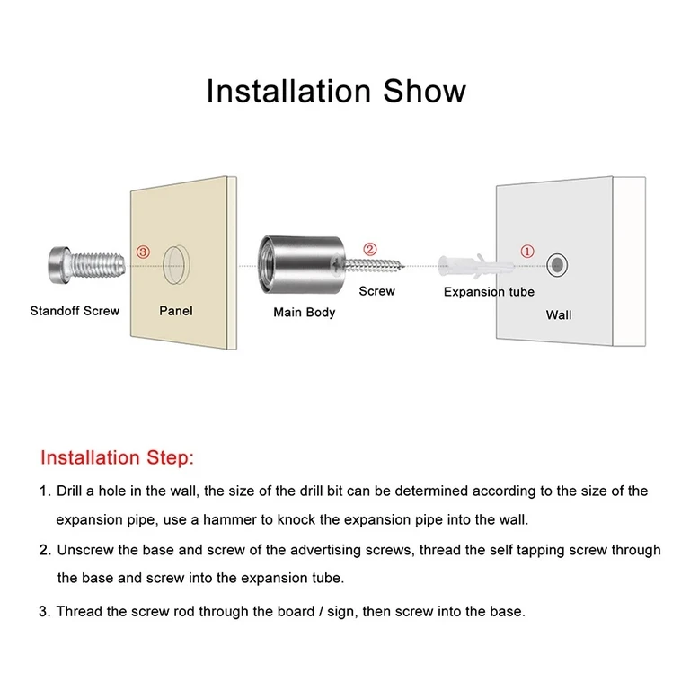 การใช้งานที่หลากหลาย: สกรูยึดผนังของเราเหมาะสำหรับบ้าน โรงแรม บริษัท สำนักงาน ซูเปอร์มาร์เก็ต ร้านค้า ตลาด ห้องนอน เช่น ป้ายกระจก ป้ายอะคริลิค แผ่นอะคริลิค กรอบรูปอะคริลิค ป้ายโฆษณาในร่มและกลางแจ้ง รูปภาพ และอื่นๆ