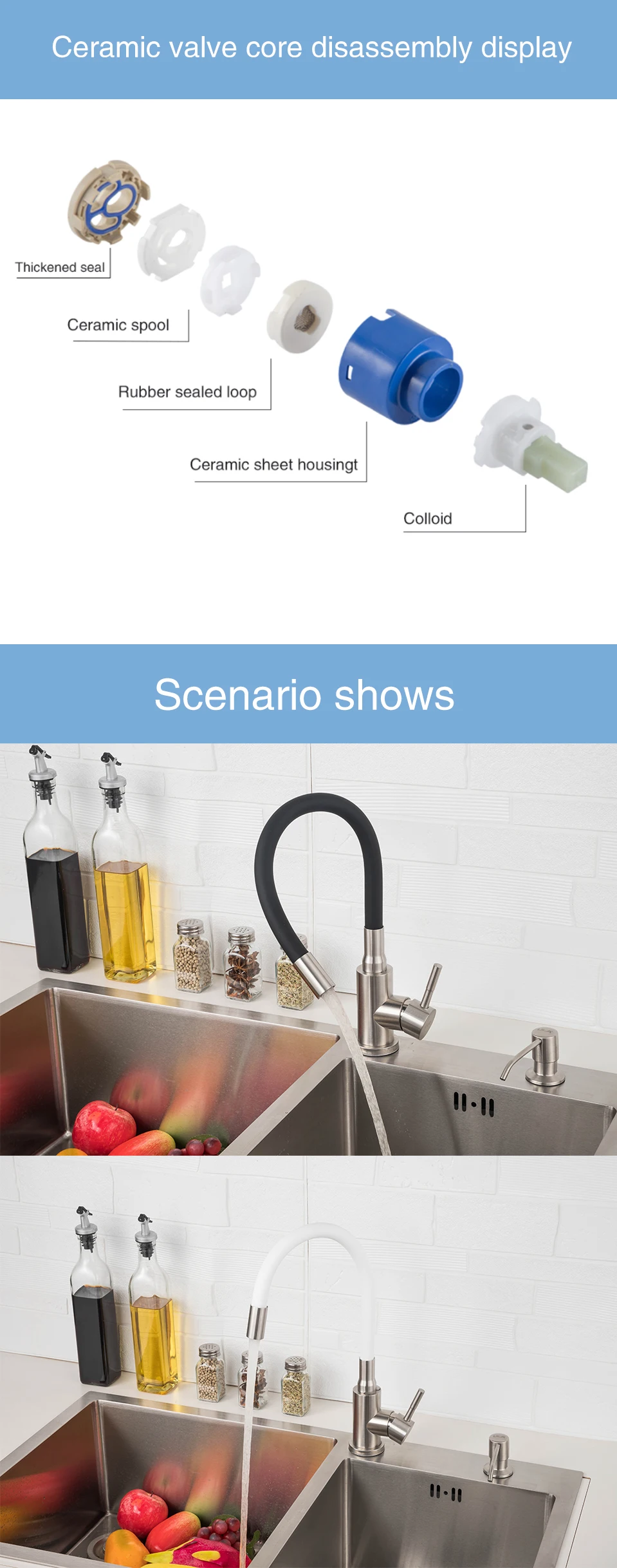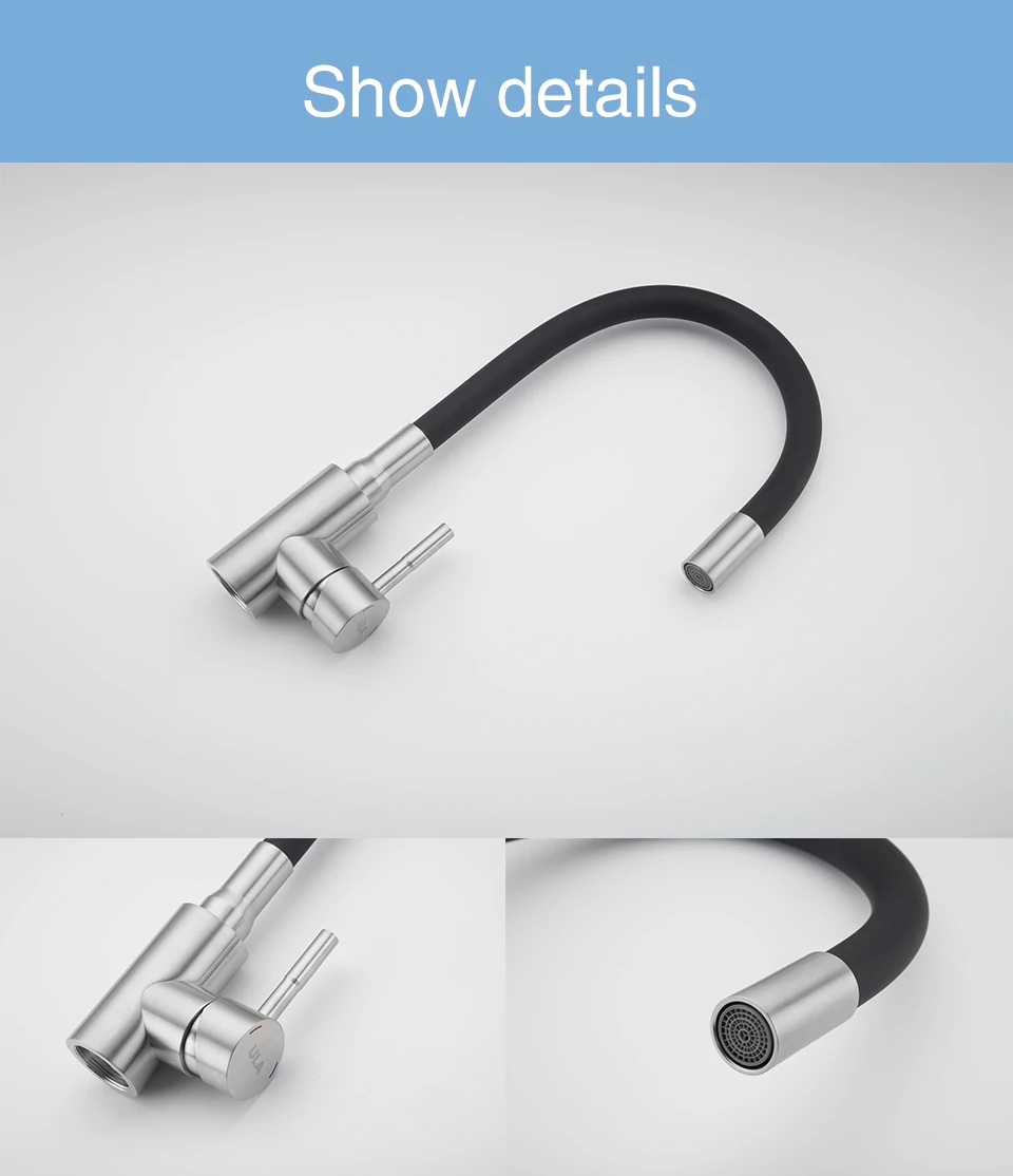 1.ตัวหลักของผลิตภัณฑ์ทำจากสแตนเลส304แข็ง (ทนทาน) และท่อน้ำออกทำจากสแตนเลสที่ห่อด้วยซิลิกาเจลซึ่งสามารถหมุนได้360องศาและสามารถโค้งงอ