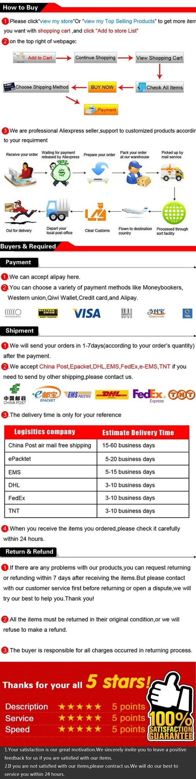 เกี่ยวกับเวลาจัดส่งคําสั่งซื้อปกติเราจะจัดส่งคําสั่งซื้อของคุณภายใน 24 ชั่วโมงผ่านการจัดส่งแบบมาตรฐานของ AliExpress จะใช้เวลาประมาณ 8-20 วัน (ประเทศหลัก) สําหรับการจัดส่งเรายอมรับการจัดส่งแบบเร่งด่วนเช่น FEDEX หรือ DHL ใช้เวลา 3-7 วัน ต้องการให้ลูกค้าจ่ายค่าจัดส่งเพิ่มเติมสําหรับบริการนี้