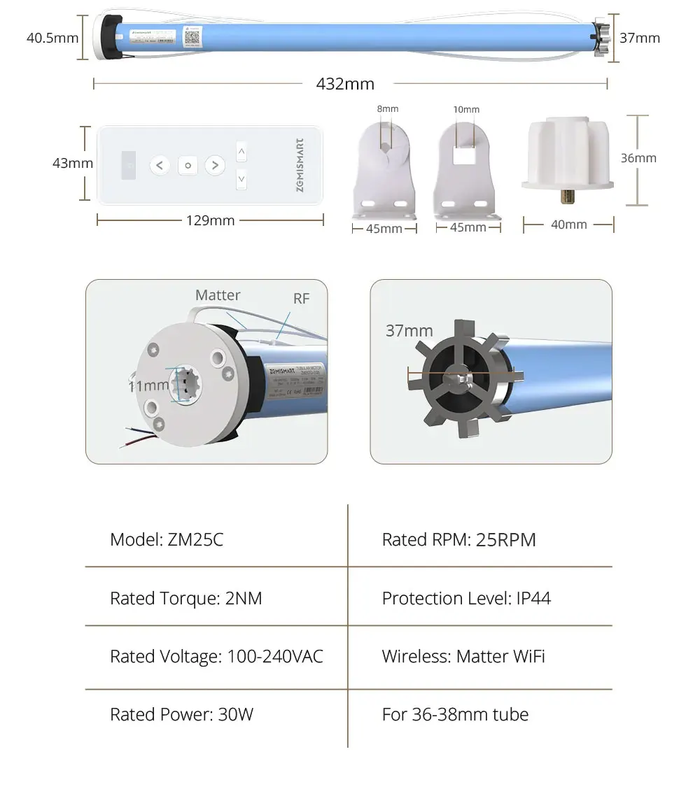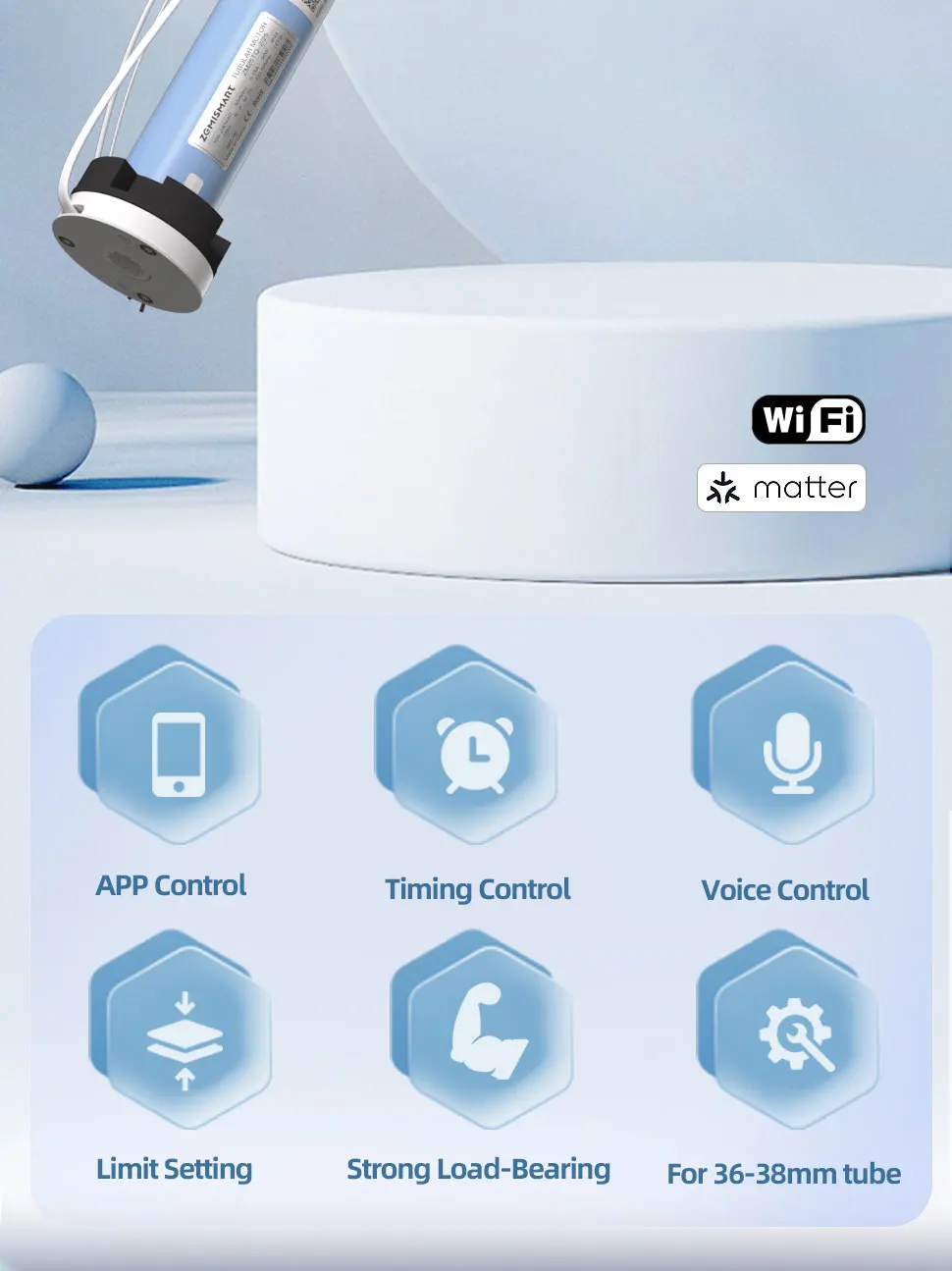 – นี่คือมอเตอร์ม่านบังแดดที่ได้รับการรับรอง WiFi Matter สําหรับท่อขนาด 36-38 มม.