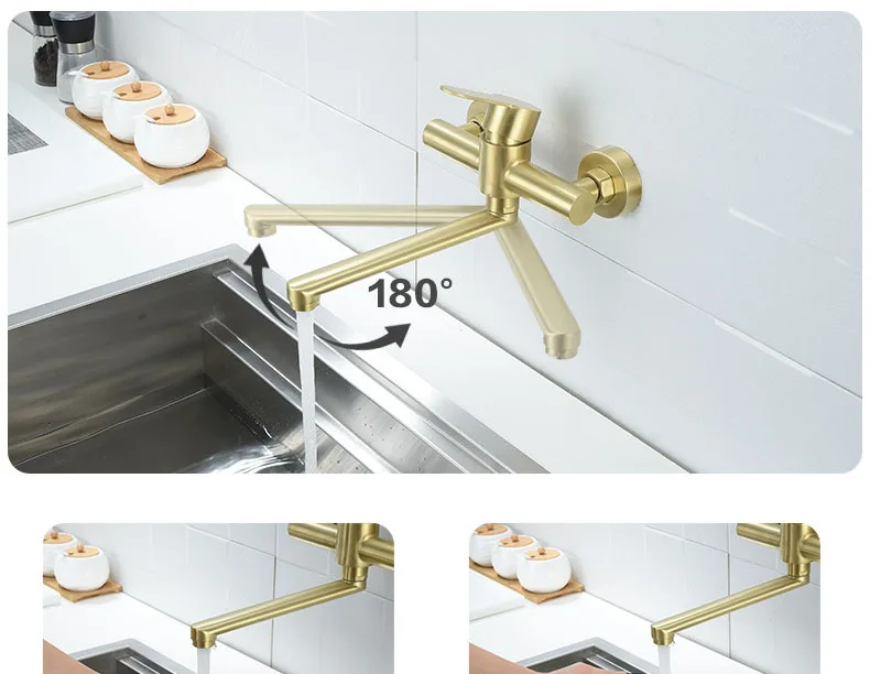 แปรงทอง 304 สแตนเลสก๊อกน้ําอ่างล้างจานติดผนังเดี่ยวหมุนก๊อกน้ําห้องครัวร้อนและเย็นนิกเกิล