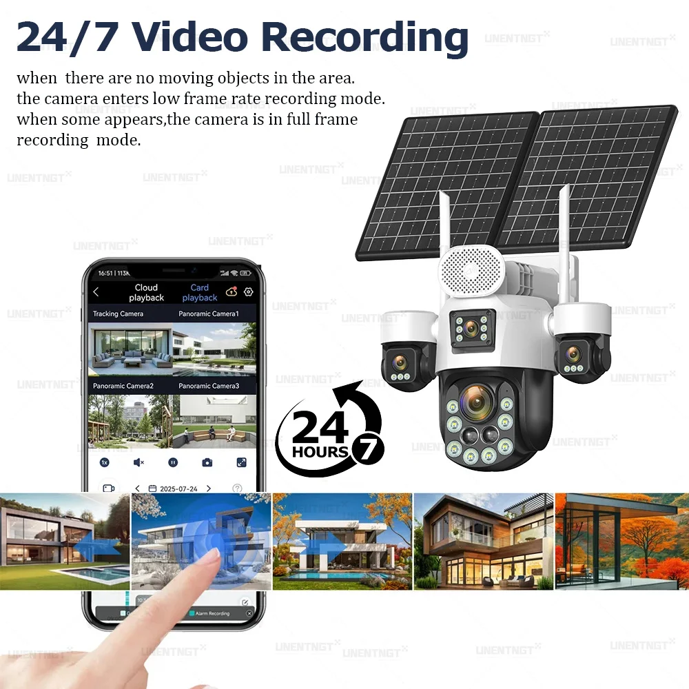 กล้องวงจรปิดพลังงานแสงอาทิตย์ 4 เลนส์ รองรับซิม 4G ซูมออปติคอล 60 เท่า ติดตามบุคคล ใช้งานกลางแจ้ง แบตเตอรี่ 31200 มิลลิแอมป์ บันทึก 24 ชั่วโมง กล้องรักษาความปลอดภัยแบบ IP