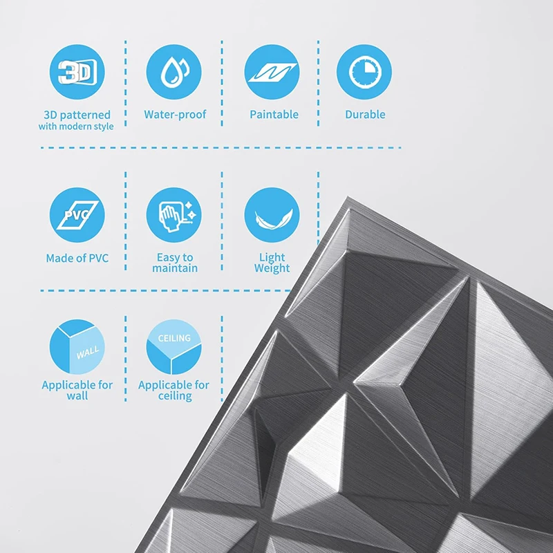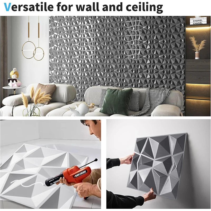 • การตกแต่งดีไซน์เพชรแผ่นผนังเหล่านี้มาพร้อมกับลวดลายเพชรที่โดดเด่น ช่วยเพิ่มความหรูหราและความมีระดับให้กับบ้านของคุณ