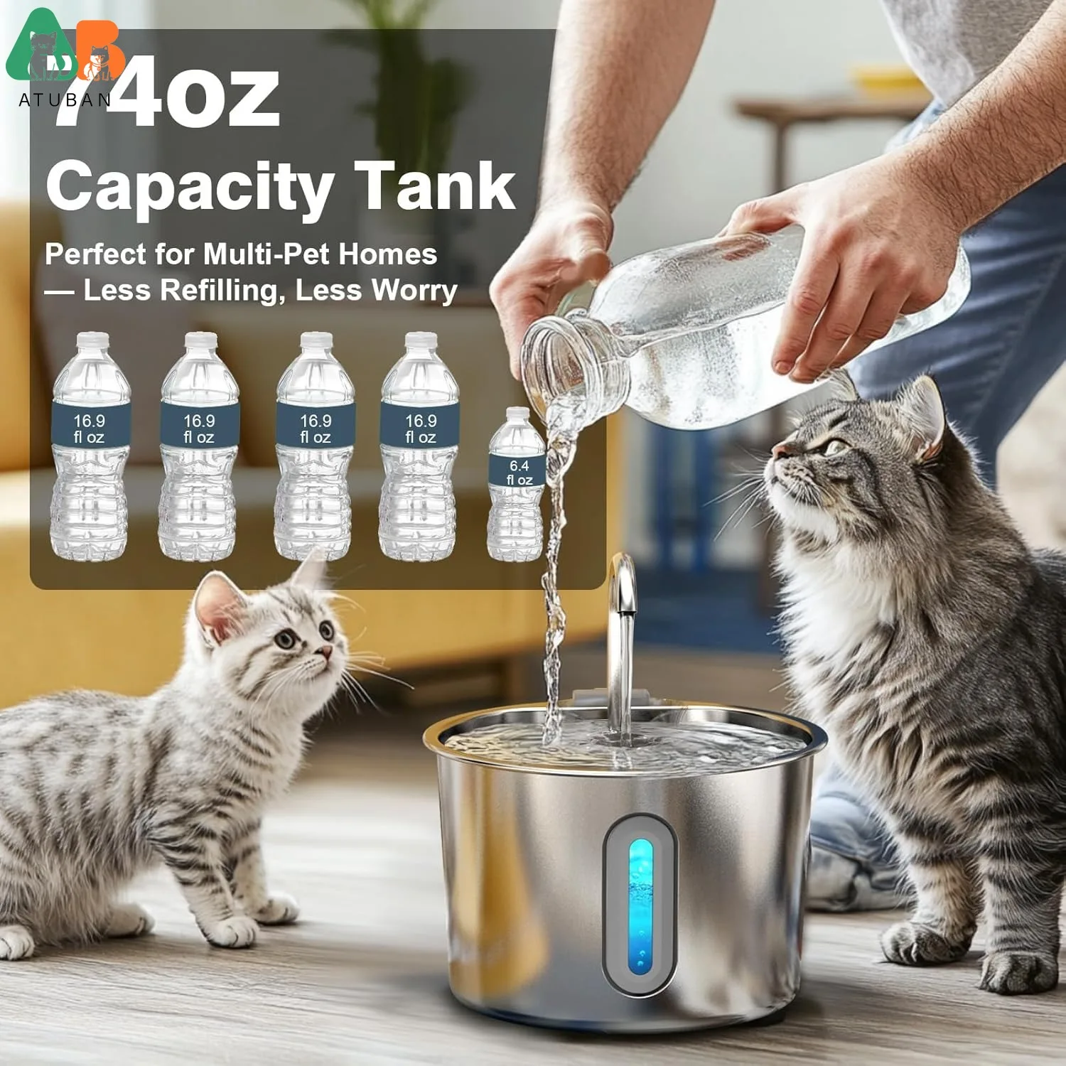 เครื่องให้น้ำแมว ATUBAN ขนาด 74 ออนซ์/2.2 ลิตร – เครื่องให้น้ำสัตว์เลี้ยงแบบสแตนเลส เงียบ ใช้งานง่าย