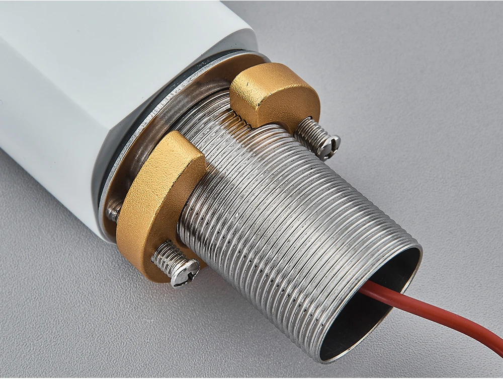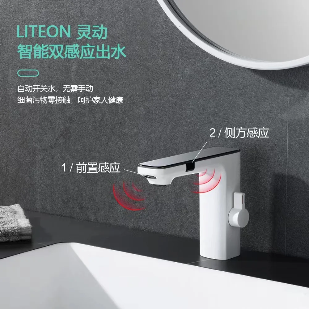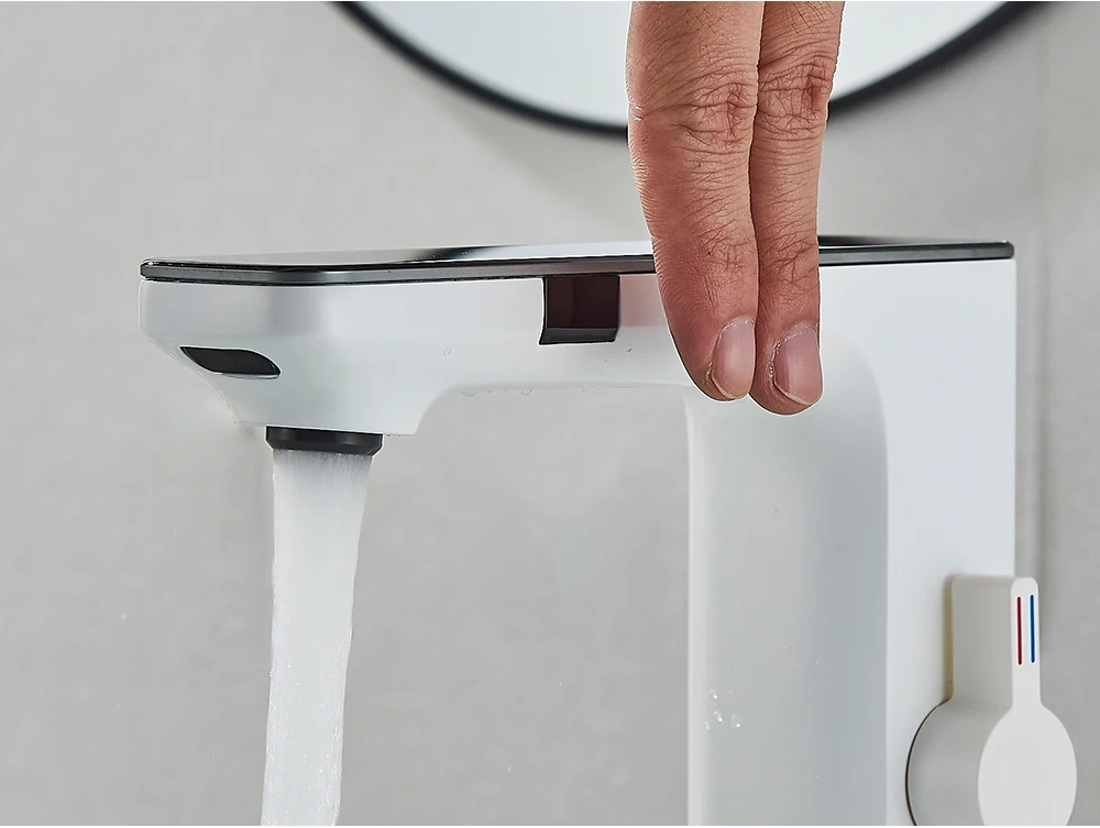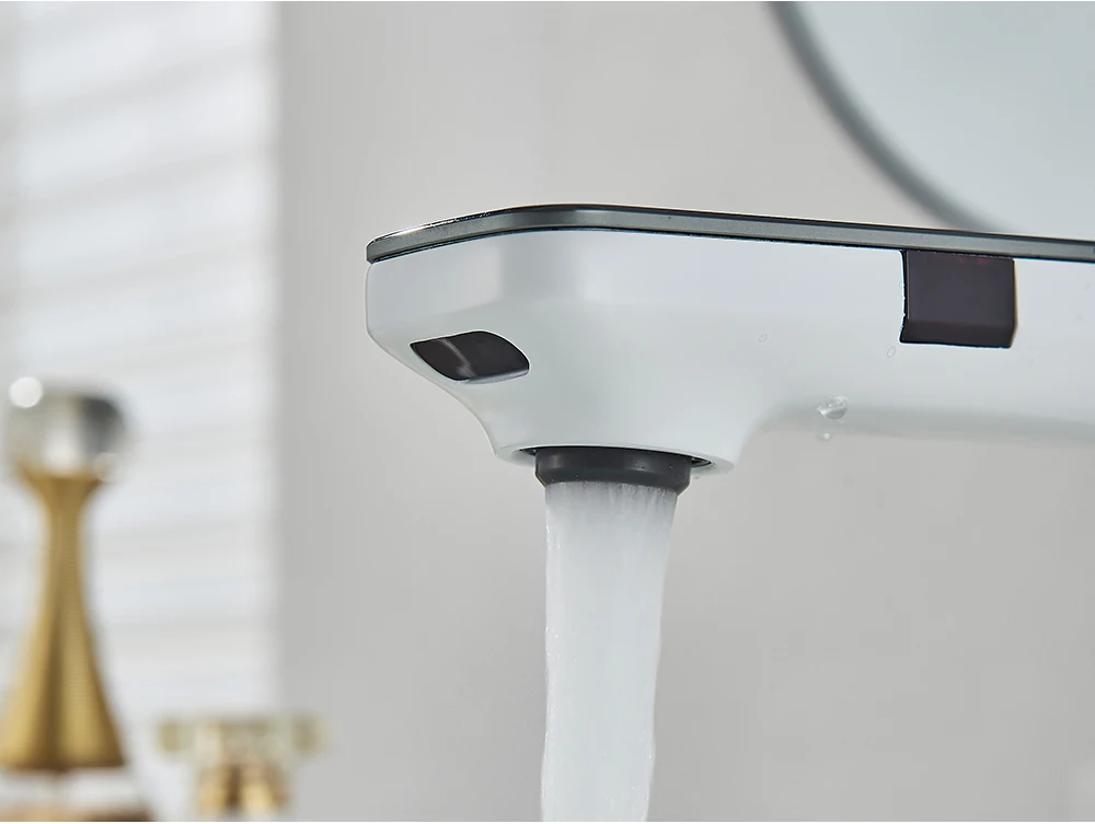 ก๊อกน้ำอัจฉริยะพร้อมหน้าจอเซ็นเซอร์สีขาว แสดงผลแบบดิจิทัล ก๊อกผสมสำหรับน้ำร้อนและน้ำเย็น ก๊อกอ่างล้างหน้าแบบไร้สัมผัสสำหรับห้องน้ำ