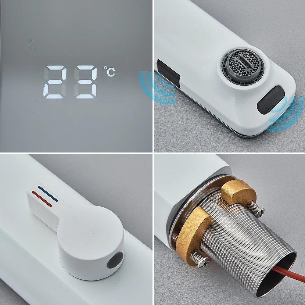 ก๊อกน้ำอัจฉริยะพร้อมหน้าจอเซ็นเซอร์สีขาว แสดงผลแบบดิจิทัล ก๊อกผสมสำหรับน้ำร้อนและน้ำเย็น ก๊อกอ่างล้างหน้าแบบไร้สัมผัสสำหรับห้องน้ำ