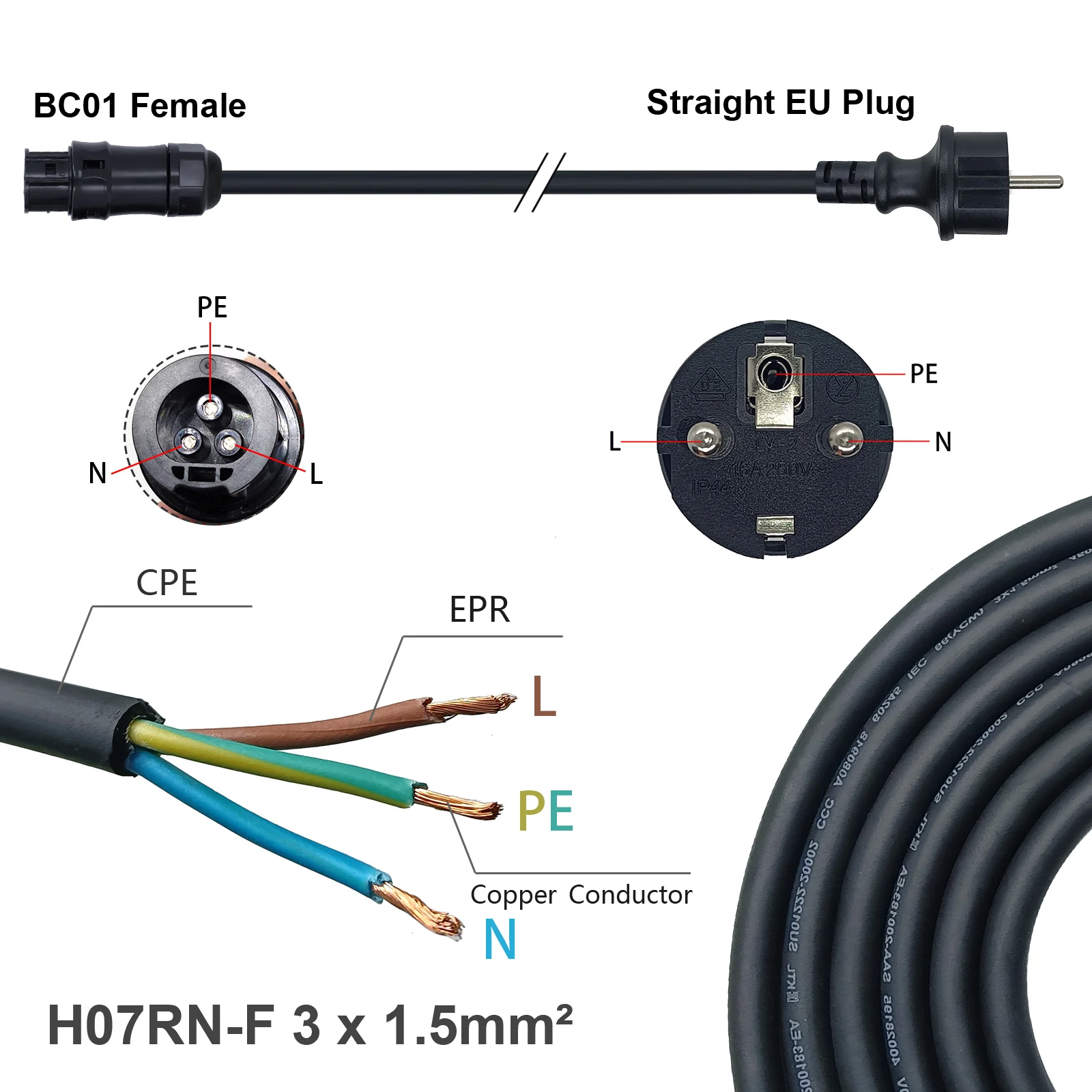 * ข้อมูลทางเทคนิค: สาย AC พร้อมขั้วต่อ BC01ตัวเมียและปลั๊กไฟในครัวเรือน H07RN-F 3 x 1.5mm ², สายยาง (2-Pin + PE) เหมาะสำหรับการเชื่อมต่อ AC ของไมโครอินเวอร์เตอร์กับซ็อกเก็ต