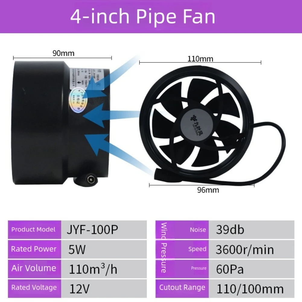 ที่มีประสิทธิภาพท่อ EXTRACTOR พัดลม 12V ระบายอากาศไอเสียพัดลม 100 มม.-110 มม.สําหรับกลางแจ้งขับเคลื่อนโดย 12V แผงพลังงานแสงอาทิตย์/อะแดปเตอร์ไฟ