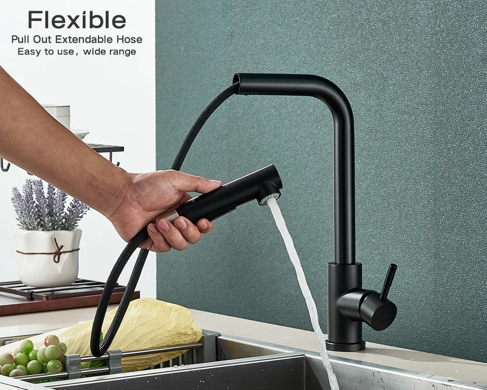 ก๊อกน้ำห้องครัวสีดำพร้อมหัวฉีดแบบดึงออก