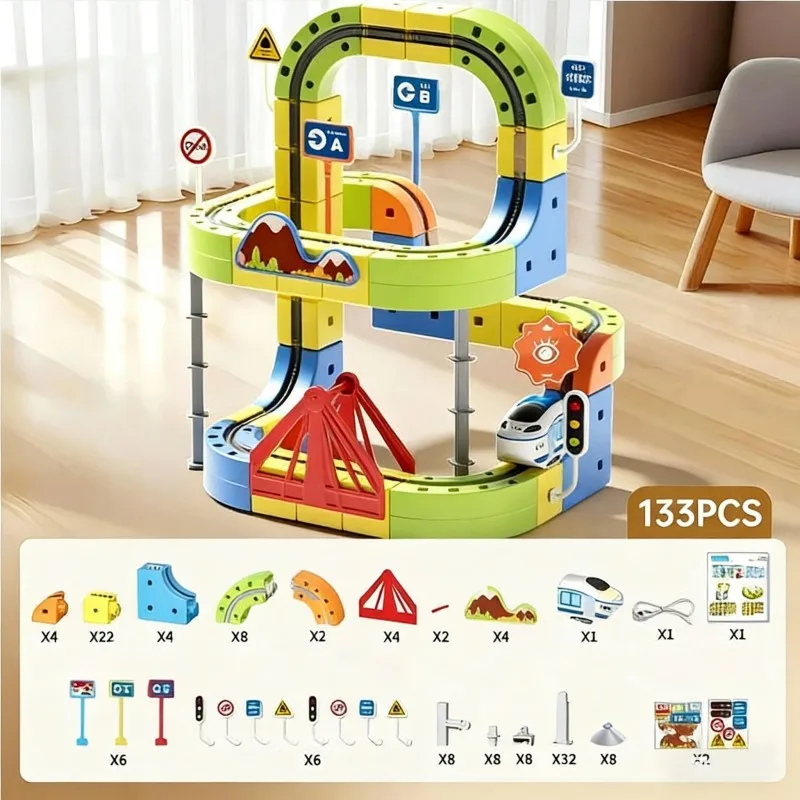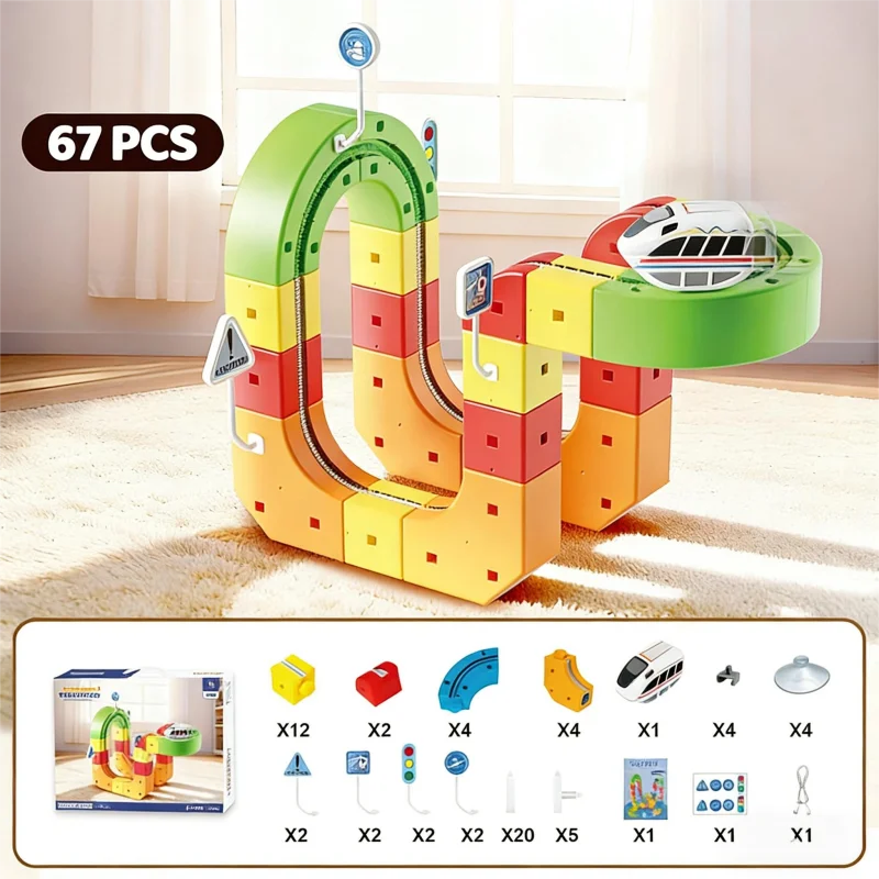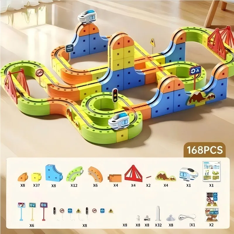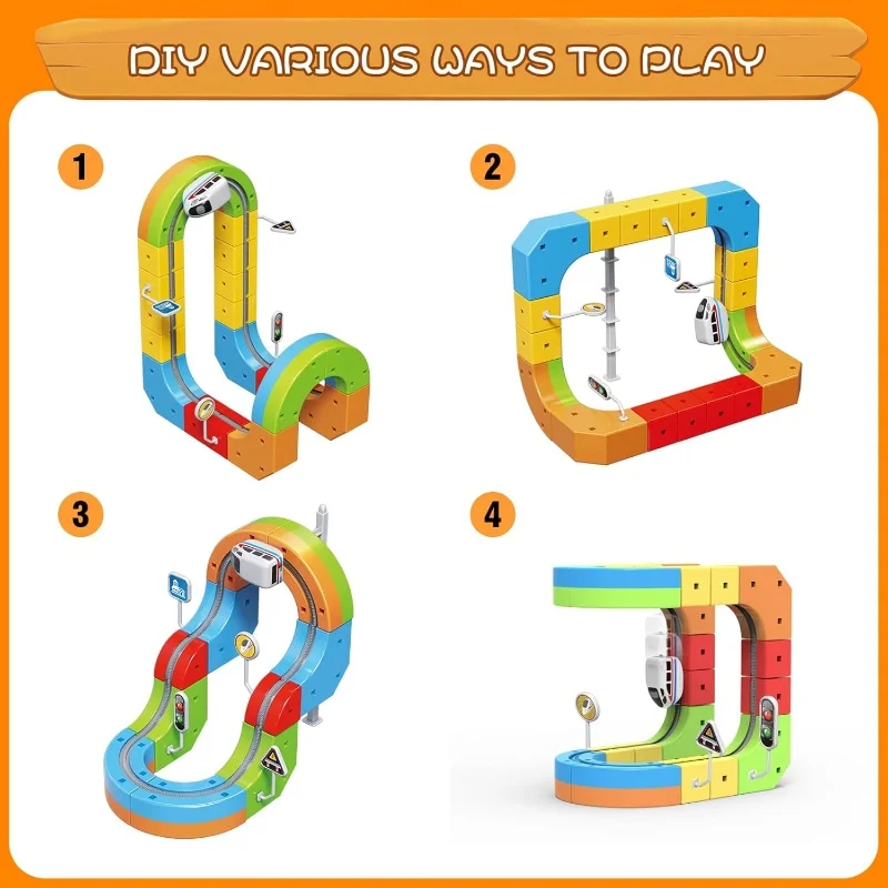 ของเล่น STEM เพื่อการศึกษาที่สนุกและเติบโตไปพร้อมกับเด็กๆ เด็กก่อนวัยเรียนสามารถสร้างรางเล็กๆ ได้ง่ายๆ ตามคำแนะนำ ในขณะที่เด็กโตสามารถออกแบบสนามแข่งที่ซับซ้อนยิ่งขึ้นได้ ของขวัญที่ดีสำหรับเด็กชายและเด็กหญิงอายุ 3-8 ปีสำหรับวันเกิด วันคริสต์มาส หรือวันหยุดใดๆ