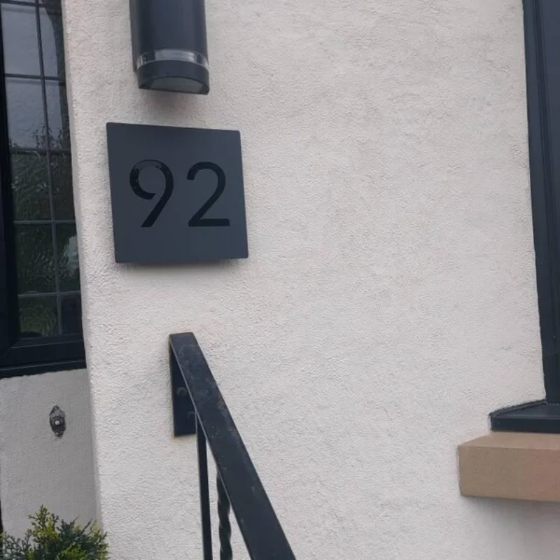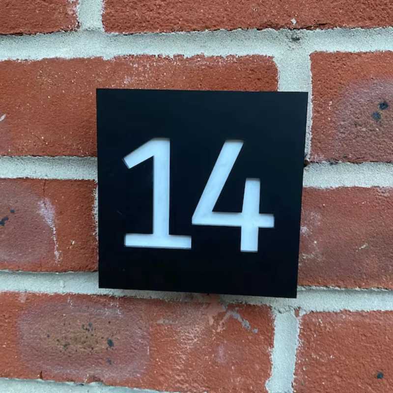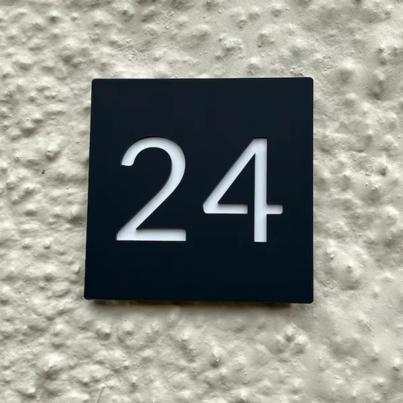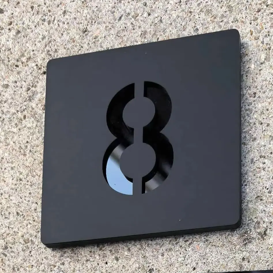 1.ป้ายบ้านสไตล์โมเดิร์นสุดล้ำเหล่านี้ถูกตัดด้วยเลเซอร์จากอะคริลิกสีดำด้าน พร้อมด้วยแผ่นอะคริลิกสะท้อนแสงที่สวยงาม