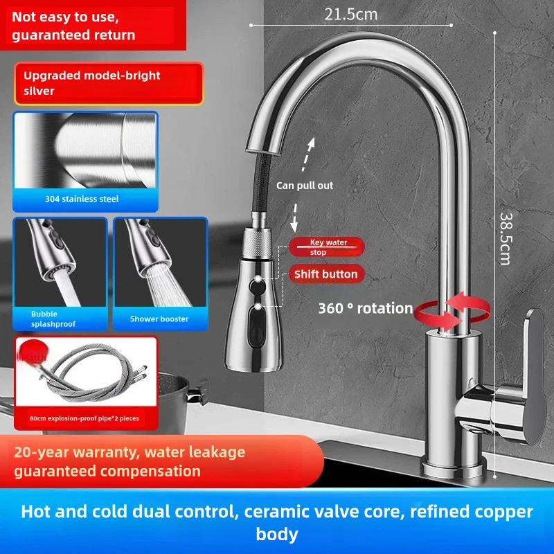• การก่อสร้างสแตนเลส:ผลิตจากสแตนเลสคุณภาพสูงก๊อกน้ำสำหรับห้องครัวนี้มีความทนทานและอายุการใช้งานที่ยาวนานทำให้มั่นใจได้ถึงประสิทธิภาพที่เชื่อถือได้และยาวนาน