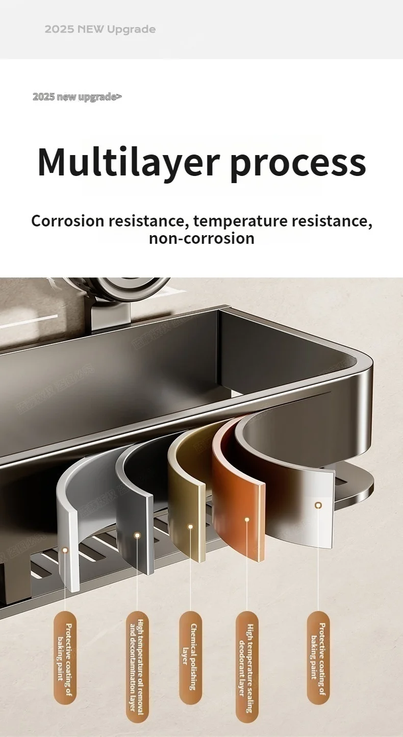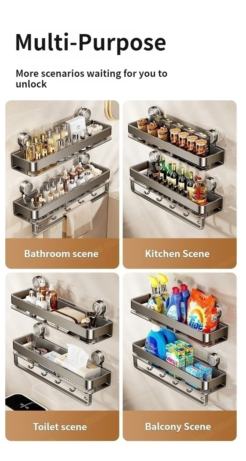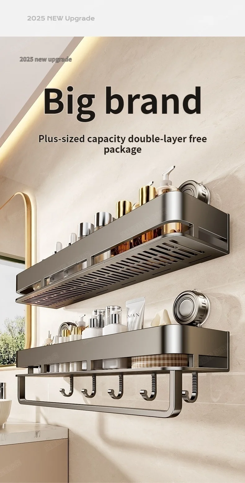 ชั้นวางของในห้องน้ำแบบติดผนัง ไม่ต้องเจาะ ติดด้วยถ้วยดูด ชั้นวางของในห้องน้ำ ชั้นวางของในห้องน้ำแบบแขวน ทำจากอะลูมิเนียมทั้งหมด อุปกรณ์จัดระเบียบห้องน้ำ