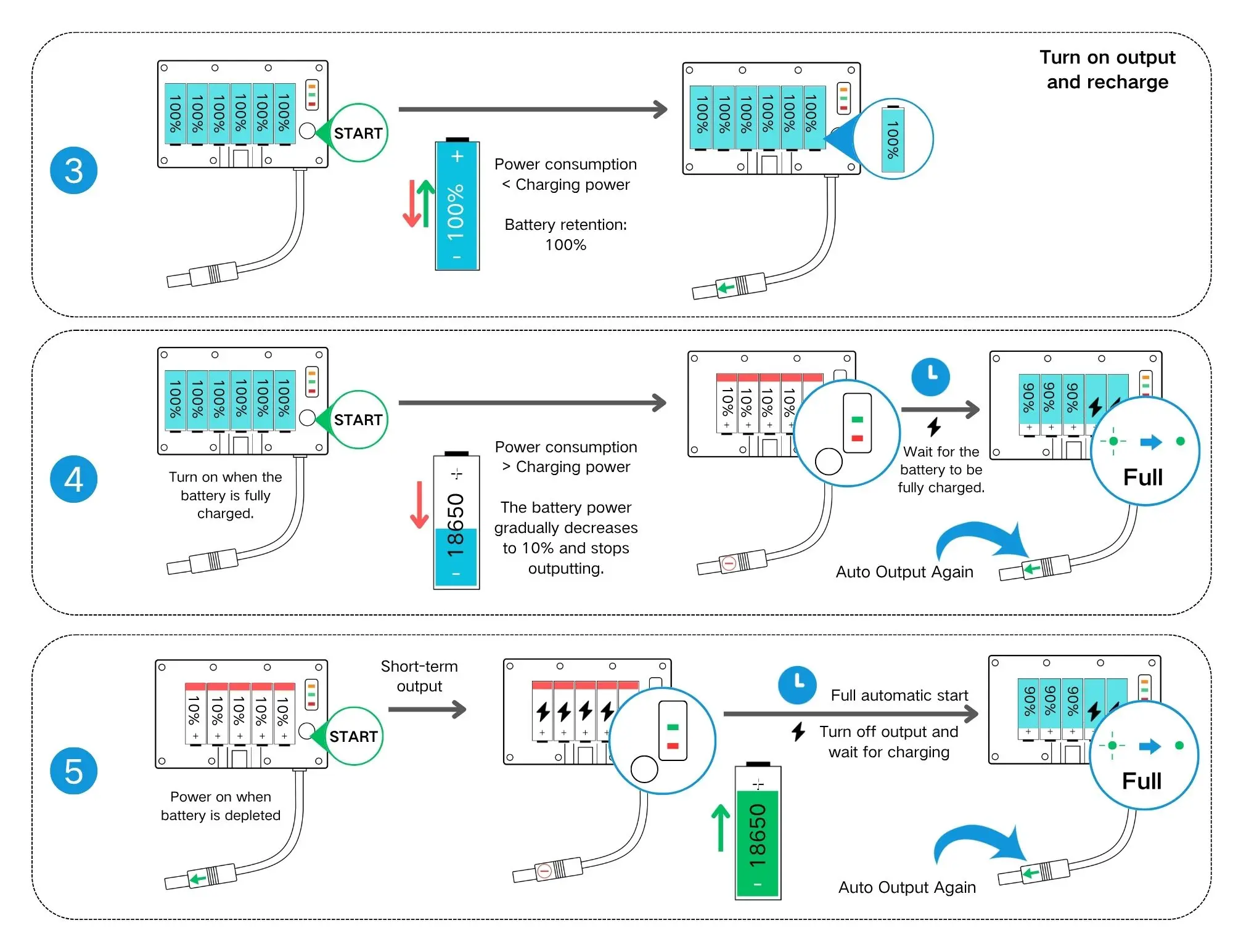 เมื่อการใช้พลังงานของอุปกรณ์ของคุณมากกว่าพลังงานที่ผลิตโดยแผงโซลาร์เซลล์ พลังงานแบตเตอรี่จะค่อยๆ ลดลงจนถึงประมาณ 10% (3.4-3.5V) ซึ่งเป็นจุดที่เอาต์พุตจะหยุดขณะนี้แผงโซลาร์เซลล์จะรอการชาร์จแบตเตอรี่ซึ่งอาจใช้เวลา 14-16 ชั่วโมงเมื่อชาร์จแบตเตอรี่จนเต็ม 90% (4V) แผงโซลาร์เซลล์จะกลับมาทำงานโดยอัตโนมัติ
