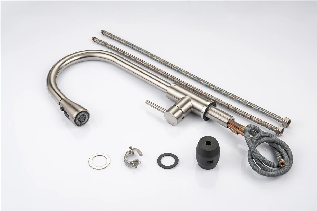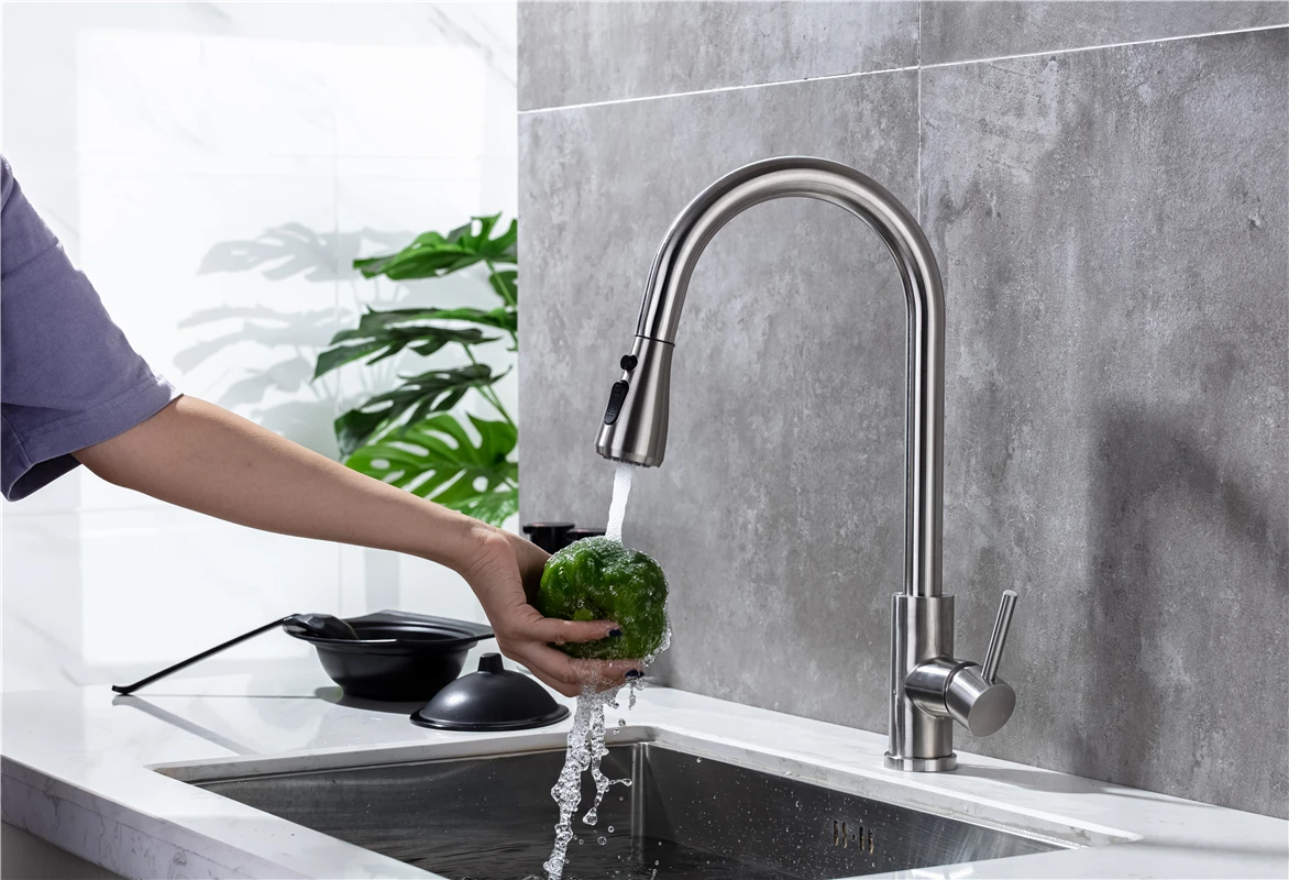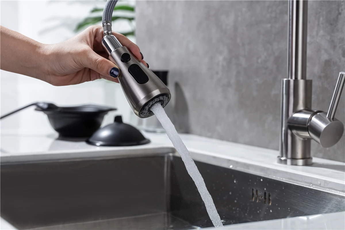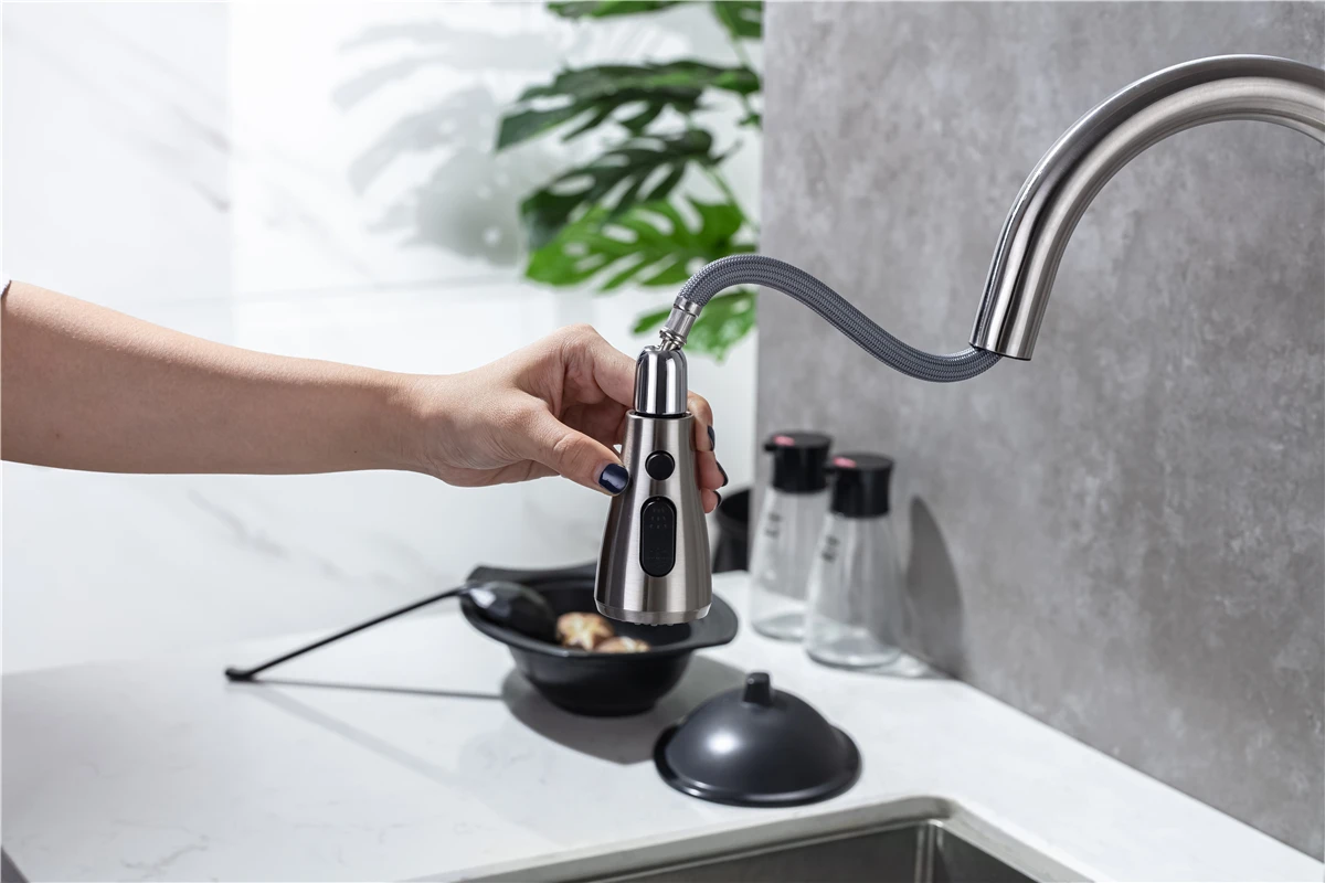 ☛ หัวฉีดแบบดึงออก: หัวฉีดและหัวพ่นหมุนได้ 360 องศา, หัวพ่นแบบโค้งสูงหมุนได้ 360 องศา สามารถให้การล้างอ่างล้างจานได้รอบด้าน, ก๊อกน้ำแบบมือจับเดี่ยวสามารถควบคุมอุณหภูมิและปริมาณน้ำได้สะดวกยิ่งขึ้นก๊อกน้ำอเนกประสงค์สำหรับอ่างล้างจานช่วยอำนวยความสะดวกในงานต่างๆ ภายในพื้นที่ครัว