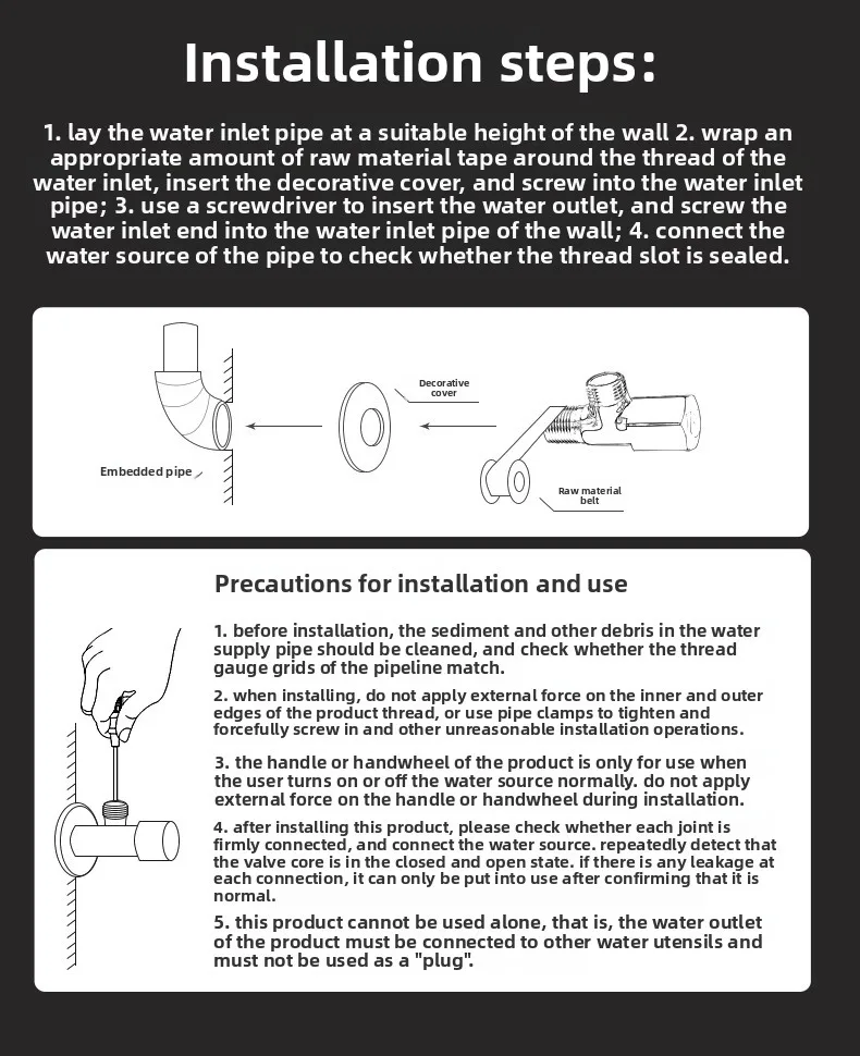 ในระหว่างการติดตั้ง จำเป็นต้องใช้เทปวัตถุดิบ โดยทั่วไป หลังจากหมุนเกลียว 10-20 รอบแล้ว ให้ปรับมุมและขันให้แน่นด้วยประแจเพื่อป้องกันการรั่วซึมของน้ำ