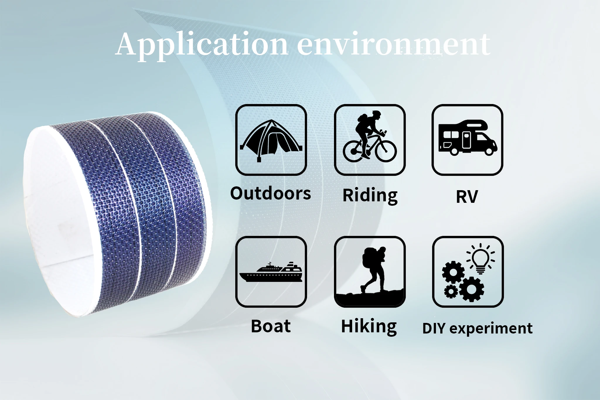 • เบาและยืดหยุ่น ขยายการติดตั้งได้: น้ําหนักเบาและบางเฉียบ แต่ยังยืดหยุ่นสามารถใช้กับพื้นผิวเว้าและนูน ติดตั้งง่ายง่ายต่อการพกพาสําหรับการตั้งแคมป์ครอบครัว เดินป่า ผจญภัยกลางแจ้ง สามารถใส่พื้นผิวรูปทรงพิเศษต่างๆ เช่น RV เรือ โดรน อุปกรณ์เพาะพันธุ์ และการตรวจสอบกลางแจ้ง ซึ่งช่วยขยายฉากการติดตั้งได้อย่างมาก