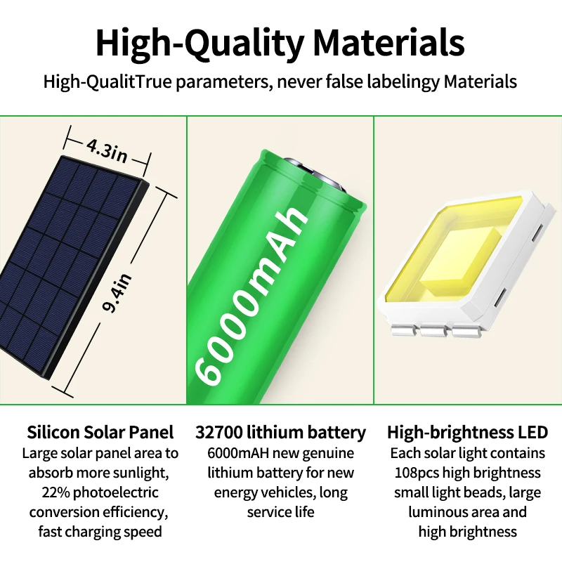 (3) ติดตั้งลูกปัด LED สว่างเป็นพิเศษ 108 เม็ด ให้เอาต์พุตความสว่างสูงถึง 1200lm 6500K พร้อมการกระจายความร้อนที่ดี ซึ่งสว่างกว่าไฟ LED พลังงานแสงอาทิตย์อื่นๆ ที่คล้ายคลึงกันมาก
