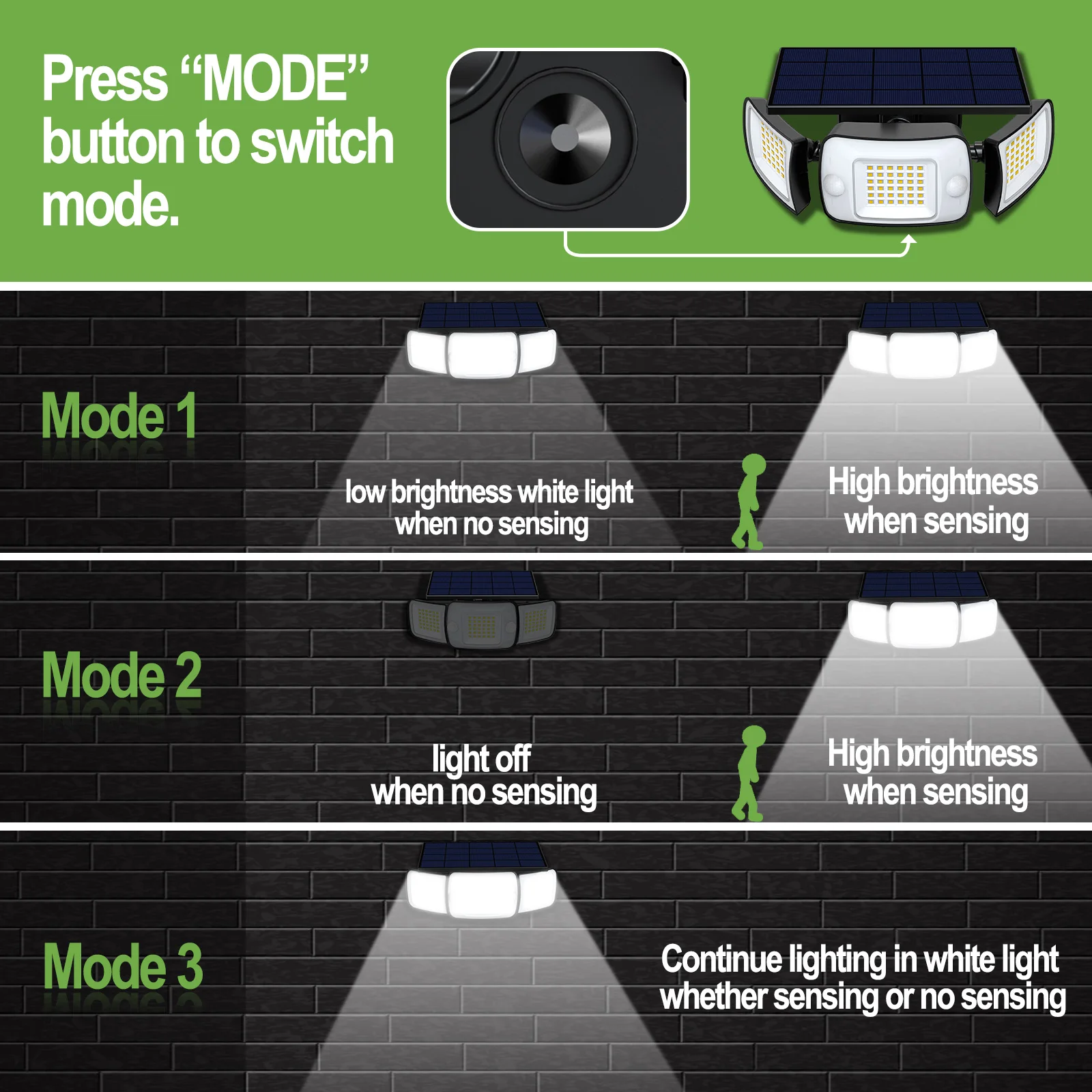 (1) โหมด 1 -ไฟตั้งค่าการตั้งค่าความสว่างต่ําตลอดเวลา และจะสว่างสดใสเมื่อเปิดใช้งานเซ็นเซอร์ตรวจจับความเคลื่อนไหว