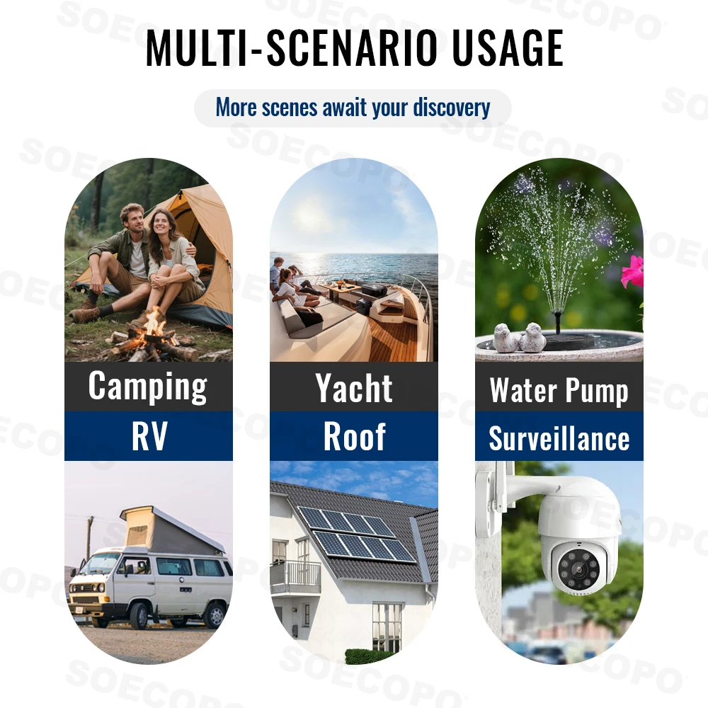 ✅ การใช้งานหลากหลายรูปแบบ: เหมาะสำหรับการตั้งแคมป์, การเดินทางด้วยรถบ้าน, แหล่งจ่ายไฟสำหรับเรือยอชต์, ปั๊มน้ำกลางแจ้ง, กล้องวงจรปิด และอื่นๆเปิดใช้งานระบบพลังงานอิสระ “พลังงานแสงอาทิตย์ + แบตเตอรี่” โดยปราศจากการพึ่งพาโครงข่าย